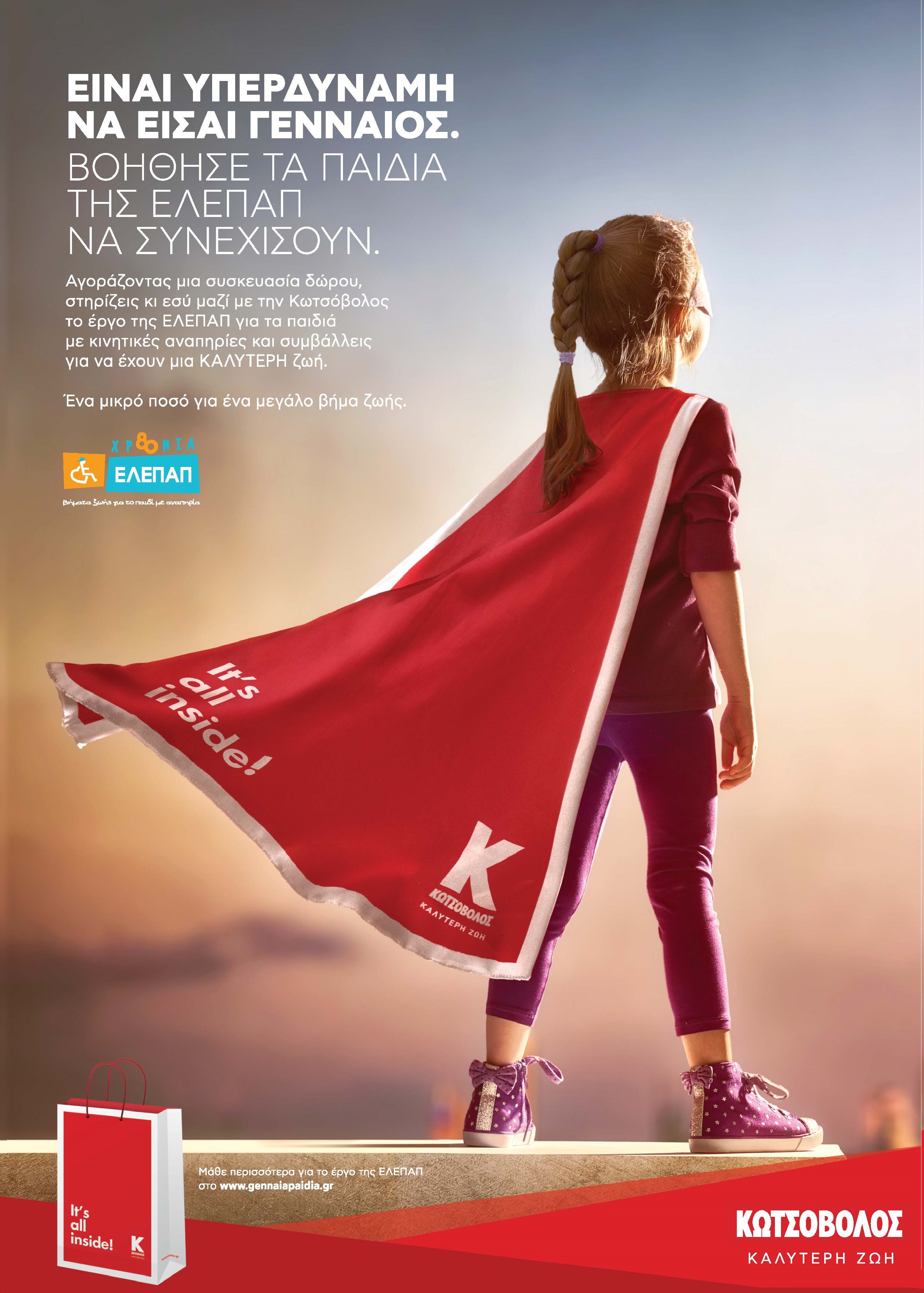 Αγοράζοντας μία συσκευασία δώρου, από όλα τα καταστήματα Κωτσόβολος, μπορεί ο καθένας να στηρίξει το έργο της ΕΛΕΠΑΠ για τα «γενναία παιδιά» με αναπηρία, και βοηθά τα παιδιά να πραγματοποιήσουν τις θεραπείες τους. Οι νέες χάρτινες συσκευασίες δώρου της Κωτσόβολος διατίθενται σε τσάντες και κουτιά, δύο μεγέθη για κάθε είδος, για όλα τα μεγέθη των δώρων. Ακόμη και ένα μικρό ποσό μπορεί να στηρίξει τα της ΕΛΕΠΑΠ να κάνουν, μικρά ή μεγάλα «βήματα ζωής».