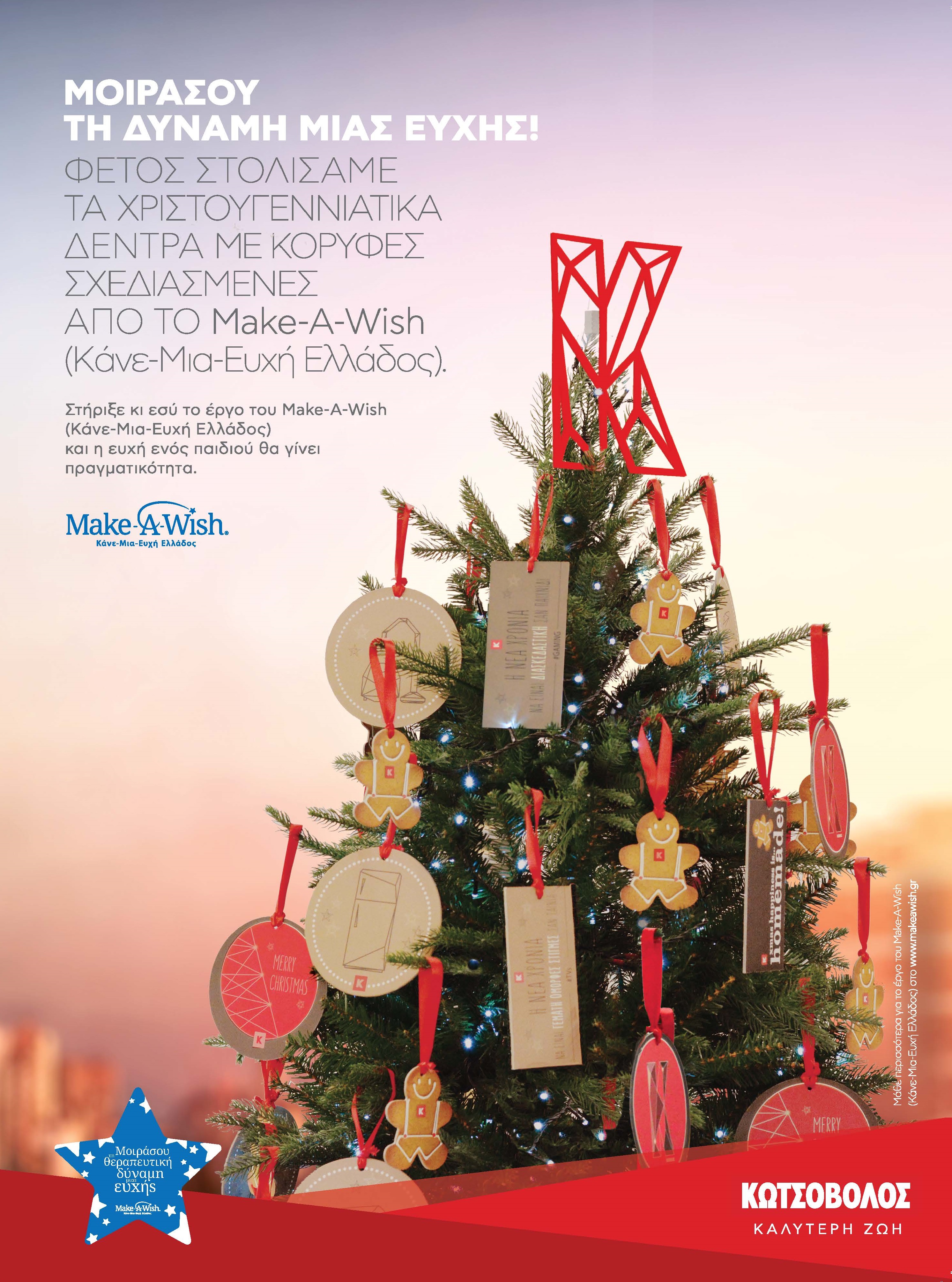 Παράλληλα, φέτος, όλα τα Χριστουγεννιάτικα δέντρα στα καταστήματα Κωτσόβολος στολίστηκαν με κορυφές ειδικά σχεδιασμένες από το Make-A-Wish (Κάνε-Μια-Ευχή Ελλάδος). Η εταιρεία καλεί τον κόσμο να μοιραστεί τη δύναμη μίας ευχής και να στηρίξει το έργο του οργανισμού. Μόνο με τη βοήθειά όλων μας, η ευχή ενός παιδιού μπορεί να γίνει πραγματικότητα για να φτάσει πιο κοντά στο θαύμα της ζωής του!