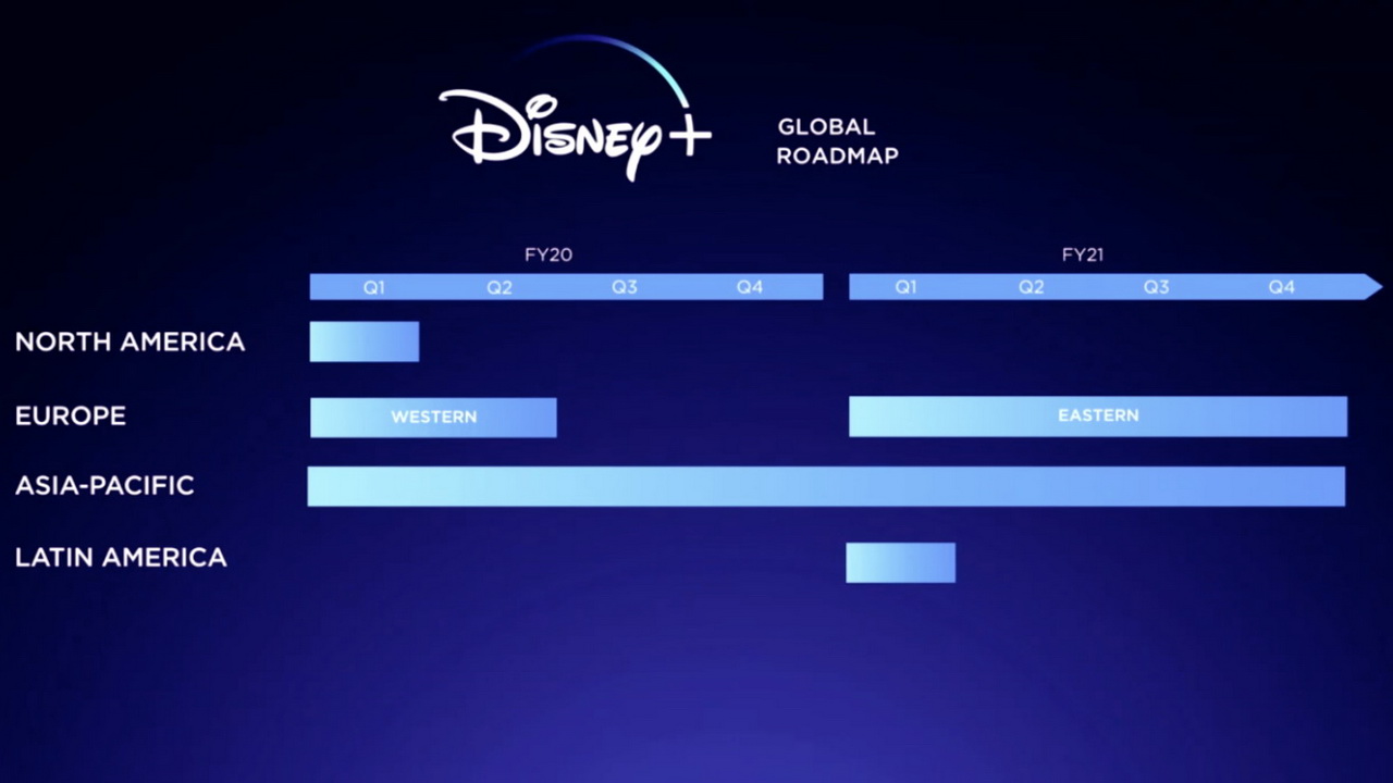 Πότε θα πρέπει να περιμένουμε την επέκταση του Disney+ και σε άλλες αγορές; Το πλάνο της Disney είναι να φτάσει η υπηρεσία σε πολλές χώρες μετά την Αμερική σε σύντομο χρονικό διάστημα. Το παρακάτω γράφημα απεικονίζει αναλυτικά τα πλάνα της εταιρείας (σημείωση: το πρώτο τρίμηνο για το οικονομικό έτος 2020 της Disney ξεκινάει τον Οκτώβριο του 2019).
