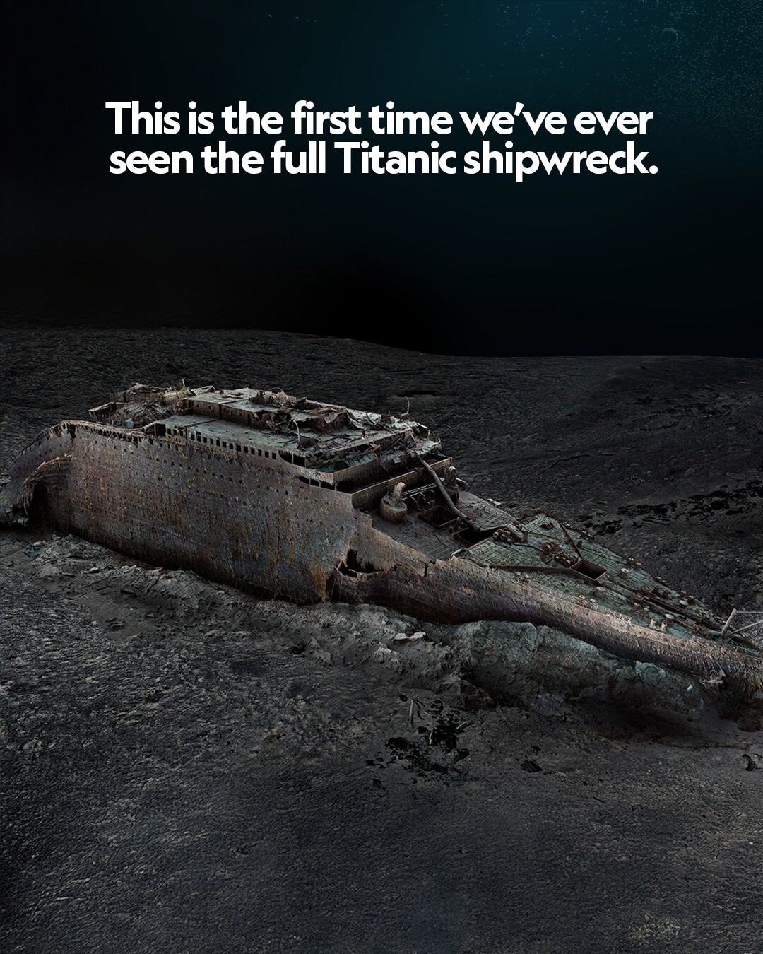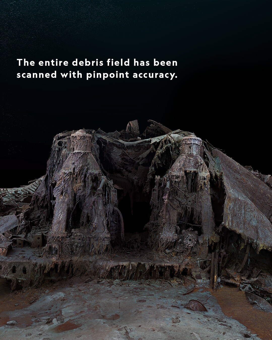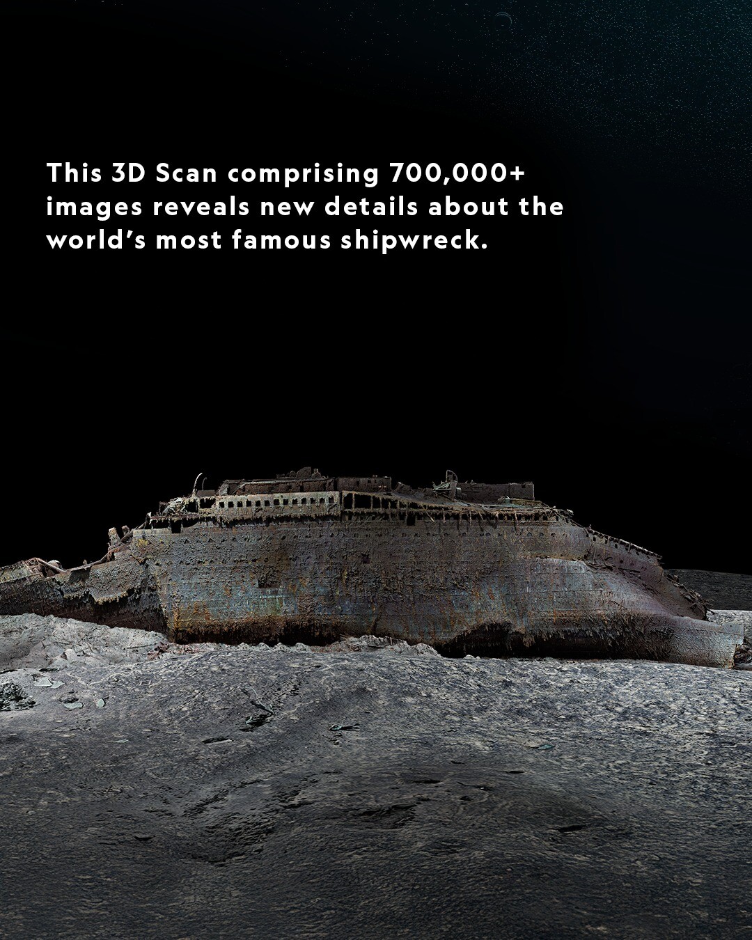 Η τρισδιάστατη αναπαράσταση δημιουργήθηκε από 700.000 εικόνες που τράβηξαν υποβρύχια ρομπότ σε βάθος 3.800 μέτρων. Αποτελεί τη βάση για το ντοκιμαντέρ «Titanic: The Digital Resurrection» του National Geographic και αποτυπώνει Την άθικτη πλώρη με αναλογία 1:1, όπου διακρίνονται ακόμη και προσωπικά αντικείμενα επιβατών, την πρύμνη, που εμφανίζεται ως στριμμένη μάζα μεταλλικού σκελετού και έναν ανοιχτό ατμοστρόβιλο στην πρύμνη, ένδειξη ότι το σύστημα παραγωγής ενέργειας λειτουργούσε μέχρι το τέλος.