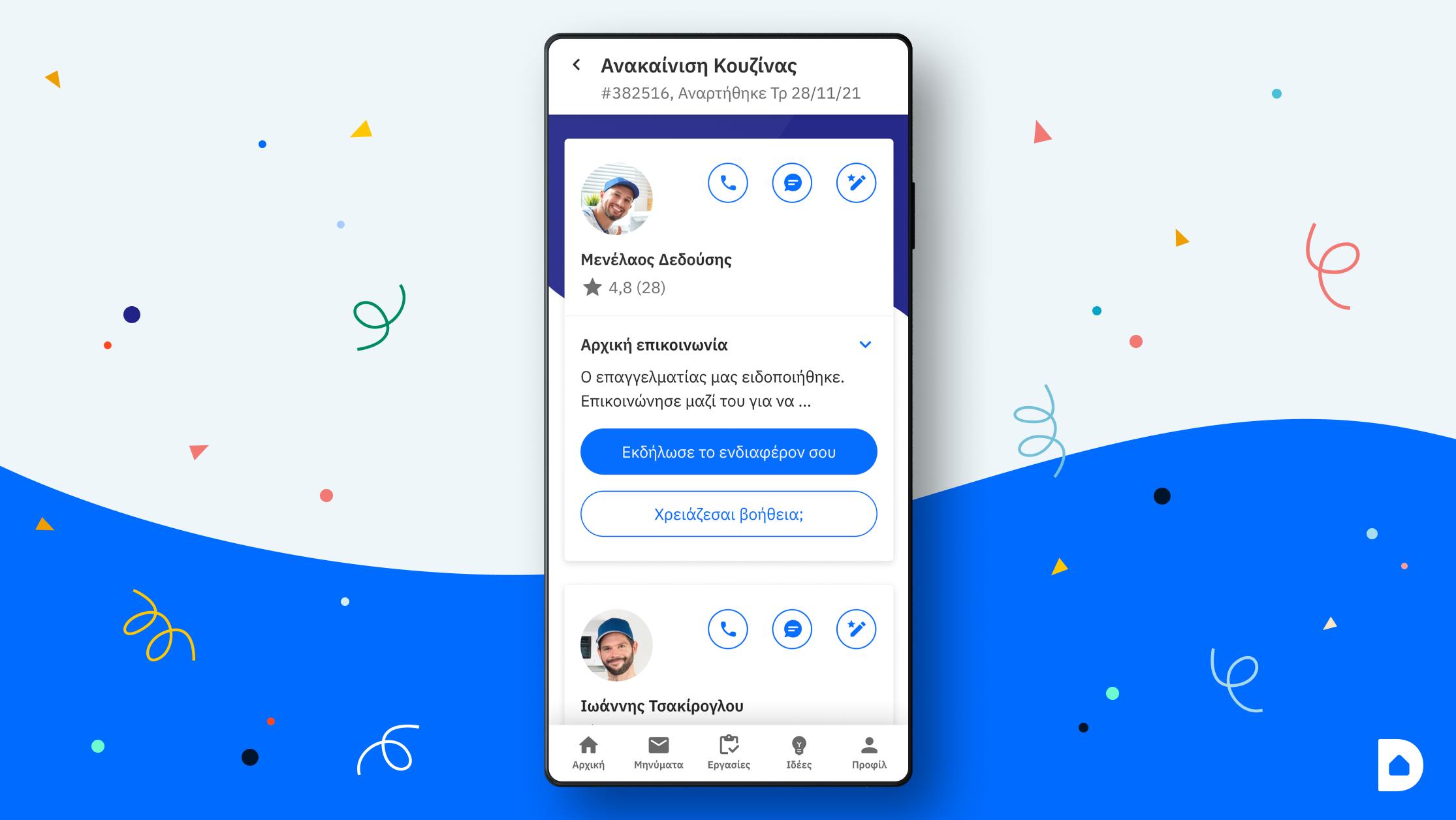 Η απαιτητική και χρονοβόρα offline διαδικασία αναζήτησης επαγγελματία για το Σπίτι εκσυγχρονίζεται ακόμη περισσότερο και μετατρέπεται σε μία απλή, γρήγορη και αξιόπιστη online εμπειρία, χάρη στο Mobile App του Douleutaras. Οι χρήστες μπορούν να βρίσκουν τον τεχνικό επαγγελματία που χρειάζονται και να διαχειρίζονται όλες τις σχετικές εργασίες από το κινητό τους, απολαμβάνοντας μεγαλύτερη άνεση και ευκολία. Η εφαρμογή είναι διαθέσιμη για λογισμικά Android και iOS.