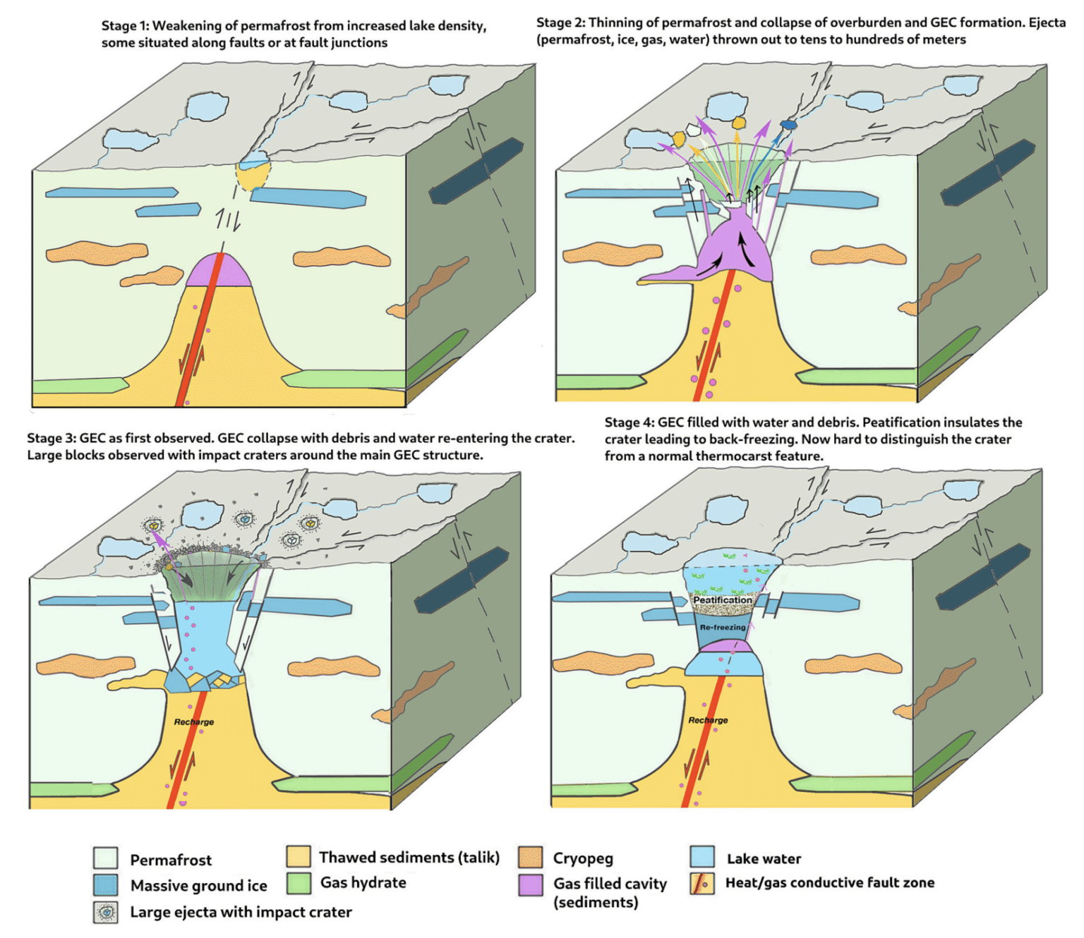 Η επιστημονική ομάδα συμφωνεί ότι η συσσώρευση μεθανίου υπό πίεση αποτελεί τον κύριο παράγοντα που οδηγεί στη δημιουργία αυτών των κρατήρων, οι οποίοι πλέον αναφέρονται ως κρατήρες εκπομπής αερίου (GECs). Ωστόσο, αντίθετα με προηγούμενα μοντέλα που απέδιδαν τον σχηματισμό τους αποκλειστικά σε εσωτερικές διεργασίες του παγετώνα λόγω κλιματικής αλλαγής, το νέο μοντέλο τονίζει πως η απαραίτητη ποσότητα αερίου και η εκρηκτική δύναμη δεν μπορεί να προέλθει μόνο από αυτές τις διεργασίες. Αντιθέτως, προτείνεται πως η θερμότητα και το φυσικό αέριο που διαφεύγουν από βαθιά ρήγματα στον βραχώδη υπέδαφος, κάτω από τον παγετώνα στις χερσονήσους Yamal και Gydan, παρέχουν την απαιτούμενη δύναμη για την ύπαρξη τέτοιων εκρήξεων.