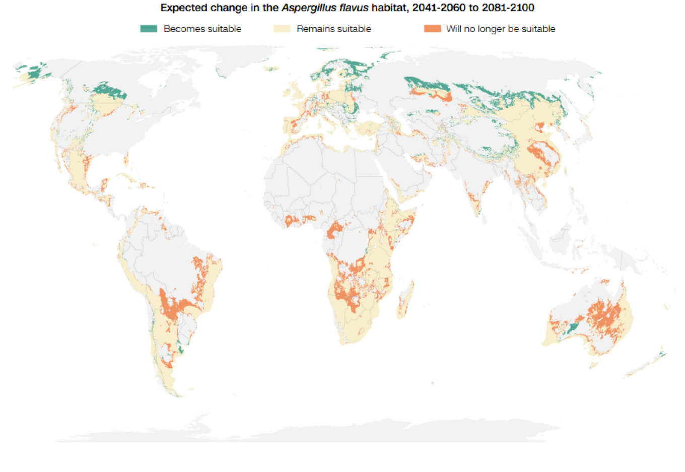• Aspergillus flavus: Προτιμά θερμά, τροπικά κλίματα και θα μπορούσε να αυξήσει την εξάπλωσή του κατά 16% αν συνεχιστεί η υψηλή κατανάλωση ορυκτών καυσίμων. Αναμένεται να εξαπλωθεί σε βόρεια Κίνα, Ρωσία και ΗΠΑ. Είναι ανθεκτικό σε φαρμακευτικές αγωγές και απειλεί και τις καλλιέργειες, με συνέπεια κινδύνους για την παγκόσμια επισιτιστική ασφάλεια. Ο ΠΟΥ το έχει κατατάξει στην «κρίσιμη» κατηγορία των μυκητιακών παθογόνων.