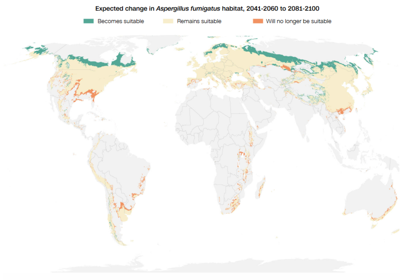 • Aspergillus fumigatus: Προτιμά πιο εύκρατα κλίματα και αναμένεται να αυξήσει την εξάπλωσή του κατά 77,5% έως το 2100, εκθέτοντας εν δυνάμει 9 εκατομμύρια ανθρώπους μόνο στην Ευρώπη.