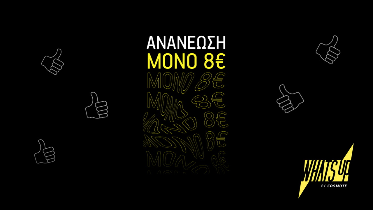 Με σύμμαχο την κορυφαία εμπειρία mobile Internet που προσφέρει η COSMOTE, οι χρήστες του WHAT’S UP απολαμβάνουν απίστευτα γρήγορες ταχύτητες στο βραβευμένο ως το γρηγορότερο δίκτυο κινητής της χώρας, σύμφωνα με την Ookla®. Το COSMOTE 5G, το μεγαλύτερο 5G δίκτυο στη χώρα , προσφέρει πανελλαδική πληθυσμιακή κάλυψη που ξεπερνά το 80%, ενώ σε Αθήνα και Θεσσαλονίκη η κάλυψη έχει ήδη φθάσει στο 97% και 90% αντίστοιχα. Σε συνδυασμό με τα οικονομικά πακέτα απεριόριστων data, το WHAT’S UP προσφέρει σε όλους τους χρήστες του μια ολοκληρωμένη εμπειρία επικοινωνίας. Περισσότερα στο whatsup.gr.
