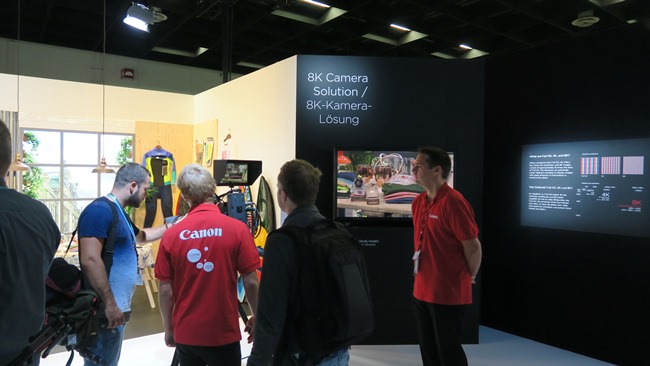 Ακόμα καλά καλά δεν έχουμε περάσει σε ανάλυση 4K όσον αφορά στο βίντεο, η Canon όμως είχε στο περίπτερό της κάμερες στα 8K (8192x4320 pixel). Οι κάμερες ήταν συνδεδεμένες με πρωτότυπες οθόνες αντίστοιχης ανάλυσης, στις οποίες φαινόταν σε πραγματικό χρόνο η απεικόνιση μέσω της συσκευής.