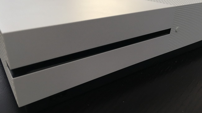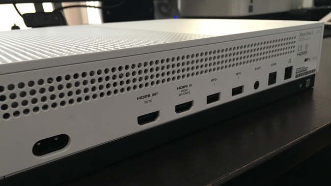 Σχεδιαστικά, η κονσόλα είναι μικρότερη σε όλες τις διαστάσεις, ενώ μέσα στο μικρότερο σασί, η Microsoft έχει «κρύψει» και το τροφοδοτικό, απομακρύνοντας για πάντα το έξτρα…τούβλο. Η κατασκευάστρια εταιρεία χαρακτηρίζει το χρώμα της κονσόλας “Robotic White” και στη συσκευασία του μοντέλου των 2ΤΒ περιλαμβάνει και ειδική βάση στήριξης, έτσι ώστε το Xbox One S να μπορεί να σταθεί τόσο οριζόντια, όσο και κάθετα. Στις άλλες δύο εκδόσεις της κονσόλας, το stand δεν θα περιλαμβάνεται, αλλά θα μπορεί να αγοραστεί ξεχωριστά από τα καταστήματα. Τι συμβαίνει με τα πλήκτρα και τις εξόδους; Στο μπροστινό τμήμα του συστήματος έχουμε πλέον τα πλήκτρα eject και ενεργοποίησης/απενεργοποίησης (που δεν είναι αφής), καθώς και το IR. Μπροστά, ακριβώς κάτω από το drive, μεταφέρθηκε η θύρα USB που βρισκόταν στο αριστερό τμήμα της πρώτης έκδοσης, ενώ στα δεξιά δεν υπάρχει τίποτα απολύτως. Στο πίσω μέρος συναντάμε τις δύο θύρες HDMI 2.0a με HDCP 2.2 (In και Out), άλλες δύο θύρες USB, καθώς και τις σχετικές υποδοχές IR Out, S/PDIF και LAN.