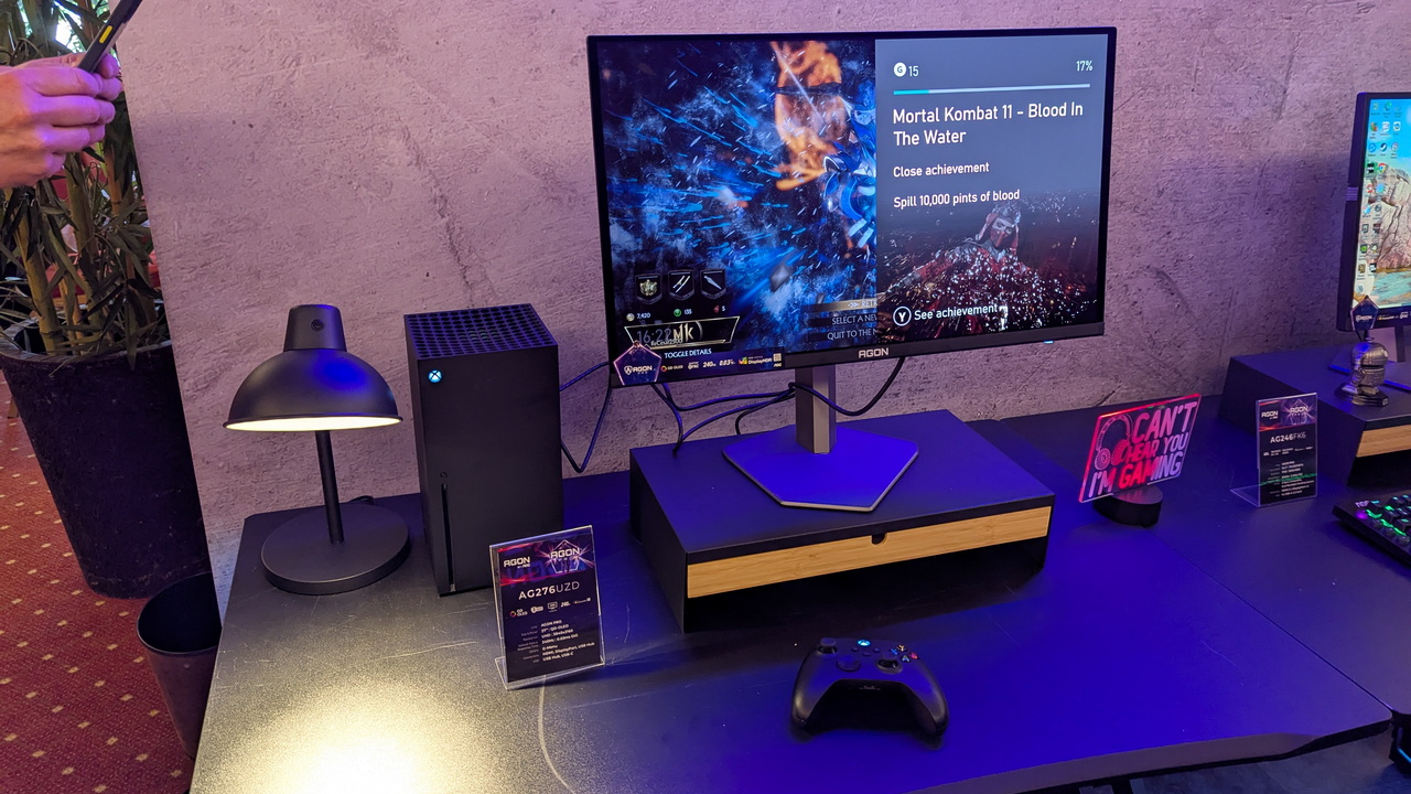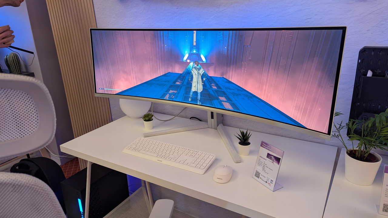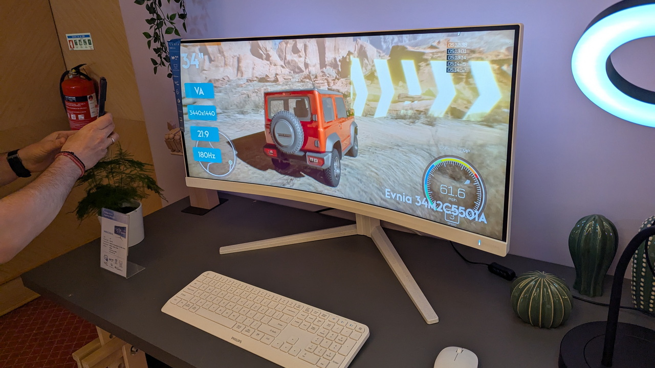 Εισερχόμενοι στον χώρο της παρουσίασης, αμέσως βλέπουμε να ξεχωρίζουν τα OLED panels και από τις δύο σειρές. Τα ζωηρά χρώματα και η πρακτικά άπειρη αντίθεση που προσφέρουν κάνουν τη διαφορά άμεσα αντιληπτή και το use case που χρησιμοποιούσαν κατά το στήσιμο τους στον χώρο κάνει σαφές το μήνυμα που θέλει να περάσει η MMD-Philips. Η 27άρα AGON AG276UZD τρέχει ένα Xbox Series X και η 32άρα Evnia 32M2N8900 με ενεργοποιημένο το Ambiglow, ένα PlayStation 5. Και τα δύο μοντέλα είναι εκπληκτικά “κοφτερά”, αν και συνεχίζουμε να πιστεύουμε πως η ανάλυση των 4Κ ταιριάζει περισσότερο στο μέγεθος των 32 ιντσών. Άλλο ένα highlight για μας ήταν τα δύο μοντέλα ultrawide των 34 ιντσών με ανάλυση QHD και VA Panel, τα AOC Agon Pro CU34G4Z και Philips Evnia 34M2C5501A. Δια στόματος Cezar και πάλι μετά από ερώτησή, εδώ μας γίνεται σαφής η διαφοροποίηση των δύο σειρών. Η CU34G4Z υποστηρίζει έως και 240Hz ενώ η αντίστοιχη της Evnia “περιορίζεται” στα 180Hz αλλά πάντα με την ίδια επιμονή στα ζωντανά χρώματα και την πεντακάθαρη εικόνα.