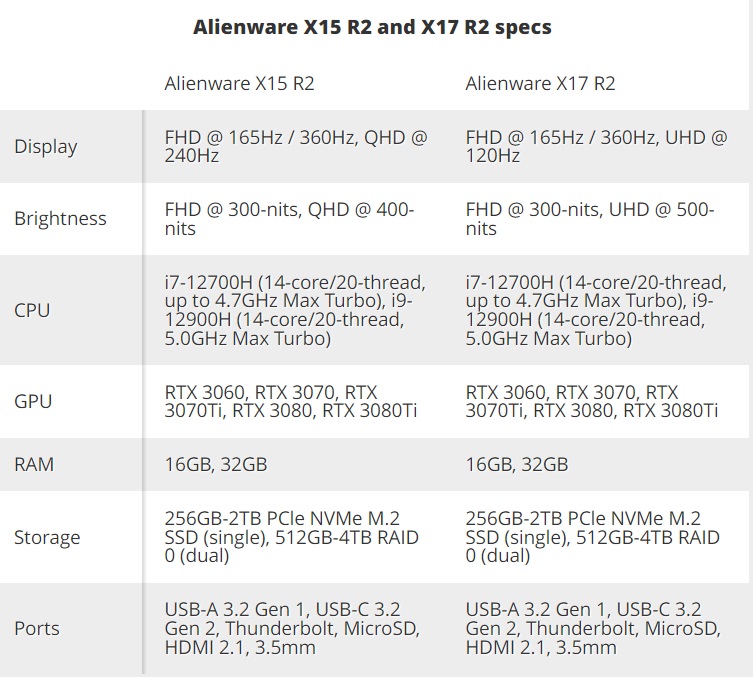 Η Dell λανσάρισε δύο νέα Alienware gaming laptops, τα X15 R2 και X17 R2. Η τιμή του βασικού μοντέλου για το πρώτο που έχει οθόνη 15,6'' ξεκινάει από τα $2.199, ενώ για το δεύτερο που έρχεται με οθόνη 17,3'' από τα $2.299. Είναι εφοδιασμένα με επεξεργαστές 12th generation Intel Core, i7-12700H ή i9-12900H με configurations των 14-core. Για την ψύξη τους χρησιμοποιείται η τεχνολογία Alienware Cryo αλλά και το Element 31 thermal interface που αποτελεί αποκλειστικό υλικό για τα Alienware. Οι επιλογές για κάρτα γραφικών ξεκινούν από τη RTX 3060 της Nvidia και επεκτείνονται ως τις RTX 3070 Ti και RTX 3080 Ti. To configuration συμπληρώνεται από 4TB RAID dual-drive SSD, έως και 32GB RAM, οθόνες FHD στα 165Hz ή 360Hz (η QHD στα 240Hz και η UHD είναι διαθέσιμη στο X17 R2 στα 120Hz) και το νέο Alienware X-Series keyboard που υπόσχεται 1,5mm travel, per-key RGB, n-key rollover και anti-ghosting.