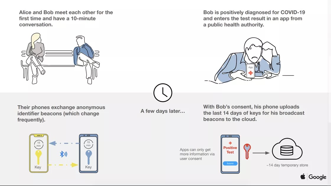Η Apple και η Google ανακοίνωσαν την ανάπτυξη ενός συστήματος που θα παρακολουθεί την εξάπλωση του κορονοϊού, επιτρέποντας στους χρήστες την ανταλλαγή δεδομένων μέσω εκπομπών Bluetooth Low Energy (BLE) και εφαρμογών που θα εγκρίνουν οι εθνικοί οργανισμοί υγείας.