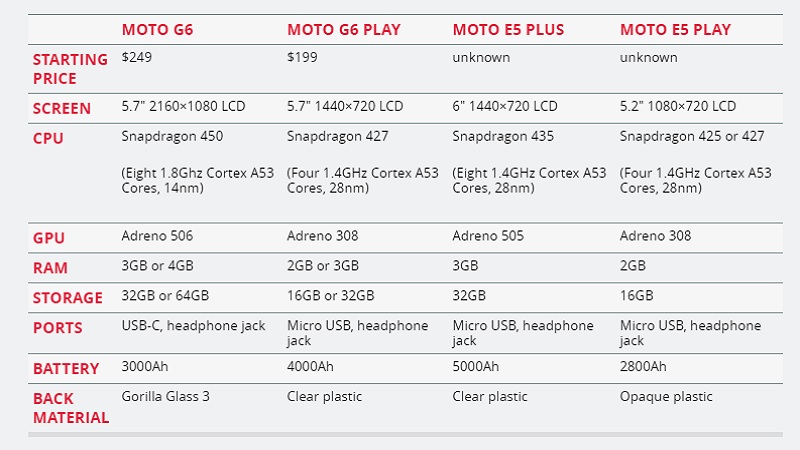 H Motorola ανακοίνωσε ότι θα λανσάρει ταυτόχρονα τέσσερα νέα smartphones. Πρόκειται για τα Moto G6, Moto G6 Play, Moto E5 Plus και Moto E5 Play. Μάλιστα η τιμή τους είναι τέτοια, που με βάση τα τεχνικά χαρακτηριστικά τους, έχουν πλεονέκτημα έναντι των ανταγωνιστών. Επιπλέον, έχουν αρκετά κοινά στοιχεία μεταξύ τους, όπως headphone jacks, MicroSD slots, fingerprint readers, a "water repellent" coating, Android 8.0 Oreo και όλες τις συνηθισμένες επιλογές συνδεσιμότητας, εκτός από NFC.  Παρακάτω μπορείτε να ενημερωθείτε αναλυτικά για τα τεχνικά χαρακτηριστικά τους και να κάνετε τις απαραίτητες συγκρίσεις.