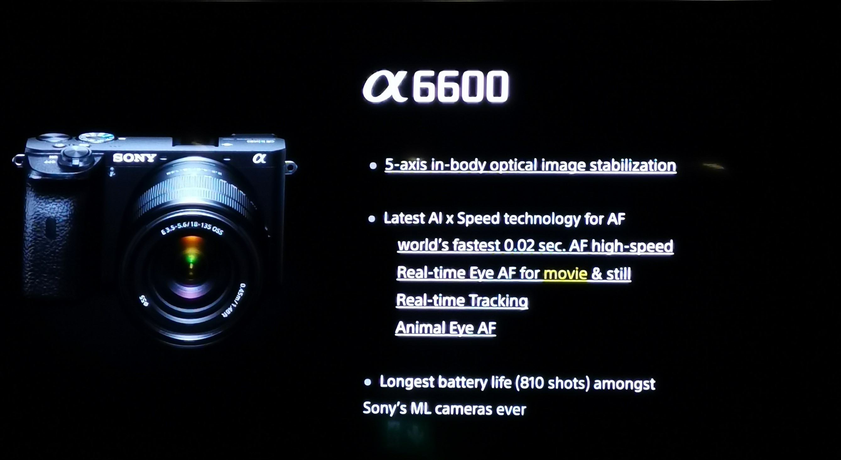 Η a6600 είναι η νέα high end πρόταση της Sony στη κατηγορία. Αναμένεται να κυκλοφορήσει τον Οκτώβρη με τιμή στα €1600, μόνο για το σώμα. Έχει αρκετά νέα και ενδιαφέροντα χαρακτηριστικά, μεταξύ των οποίων το σημαντικότερο είναι η μπαταρία που προέρχεται απο τη full frame κάμερες της Sony.