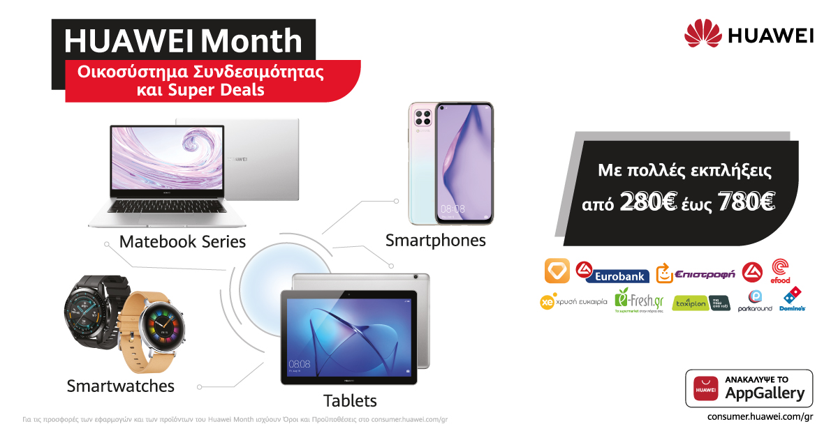 H περίοδος προσφορών Huawei Month θα διαρκέσει από 21 Σεπτεμβρίου έως και 31 Οκτωβρίου στο δίκτυο επίσημων συνεργατών της HUAWEI. Παράλληλα θα είναι διαθέσιμο και το πακέτο προνομίων μέσω των εφαρμογών στο Application Gallery σε συνεργασία με τους παρόχους κορυφαίων και δημοφιλών εφαρμογών στην Ελλάδα.