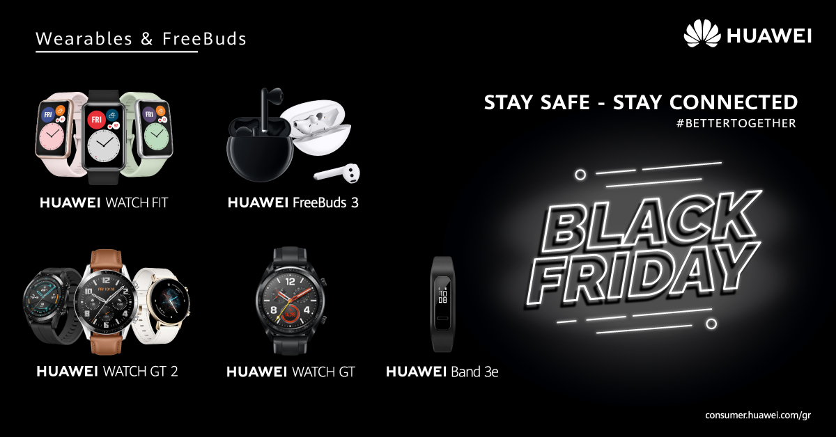 Αν μιλάμε όμως για gadgets που δεν αποχωριζόμαστε ποτέ, αυτά είναι τα Huawei Wearables και τα ακουστικά. Σε ειδική τιμή για τη φετινή Black Friday λοιπόν θα βρείτε τα ασύρματα, noise-cancelling ακουστικά Huawei Freebuds 3. Η ιδανική τους εφαρμογή στα αυτιά και η εξαιρετική τους ικανότητα να σας απομονώνουν από το περιβάλλον, εξασφαλίζουν πως τίποτα δεν θα καταφέρει να σας αποσπάσει από την επικοινωνία με τους δικούς σας ανθρώπους. Η εύκολη σύνδεσή τους με οποιοδήποτε κινητό τηλέφωνο Android ή iOS αλλά και με smartwatches ή notebooks θα σας επιτρέψει να συγκεντρωθείτε στην εργασία σας ευκολότερα, σε όσο θορυβώδες περιβάλλον και αν βρίσκεστε.