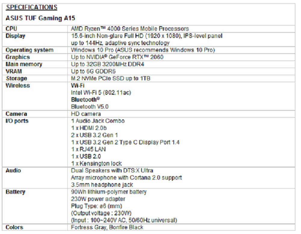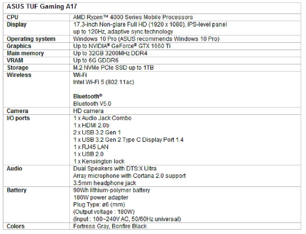 Η βασική διαφορά ανάμεσα στα μοντέλα Α και τα μοντέλα F είναι οτι θα πρώτα θα έρχονται με AMD Ryzen™ 4000 Series Mobile Processors, ενω τα δεύτερα με 10th Gen Intel® Core processors. Τα 15-inch TUF Gaming A15, F15 και τα 17-inch A17, F17 laptops θα είναι διαθέσιμα από 20 Απριλίου 2020. Παρακάτω μπορείτε να ρίξετε μια ματιά στα χρακτηριστικά τους.