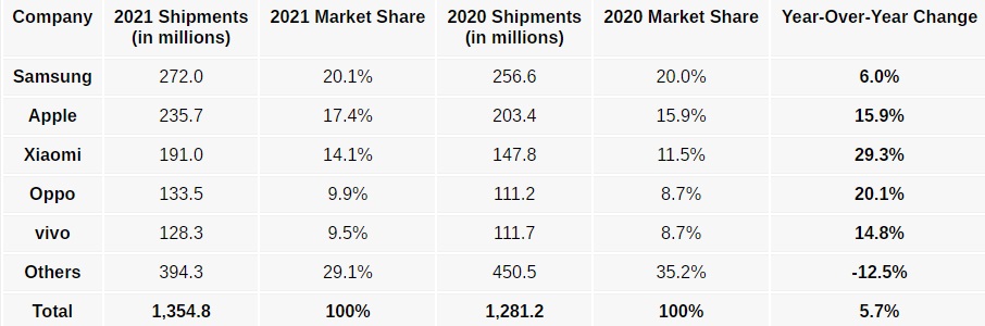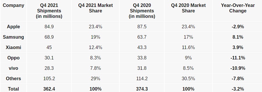 Ακόμα, χάρη στο λανσάρισμα της σειράς iPhone 13, το τελευταίο τρίμηνο του 2021 η Apple πούλησε περισσότερα smartphones από οποιαδήποτε άλλη εταιρεία. Ακολούθησαν η Samsung και Xiaomi, οι μοναδικές εταιρείες της πεντάδας με θετικό πρόσημο από έτος σε έτος.