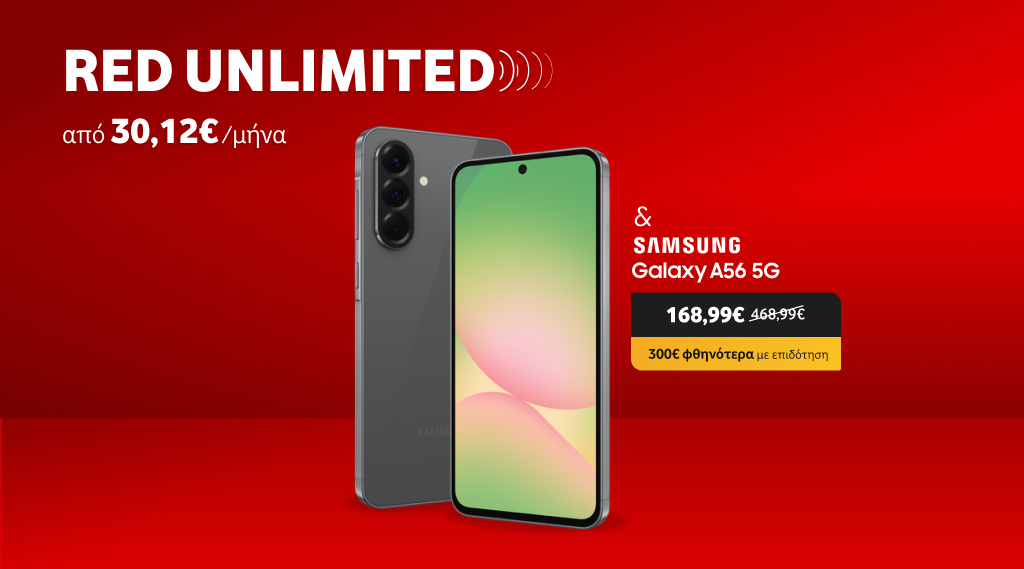 Μία ακόμη προσφορά εντοπίσαμε για την ελληνική αγορά με πακέτο που προσφέρει απεριόριστα data & ομιλία και το Samsung Galaxy A56 5G σε μειωμένη τιμή. Συγκεκριμένα, η Vodafone προσφέρει μέσα από το site της το Vodafone RED Unlimited στην τιμή των €30,12 το μήνα και έκπτωση €300 για το Samsung Galaxy A56 5G, το οποίο από τα €468,99 (επίσημη προτεινόμενη τιμή) πέφτει στα €168,99.