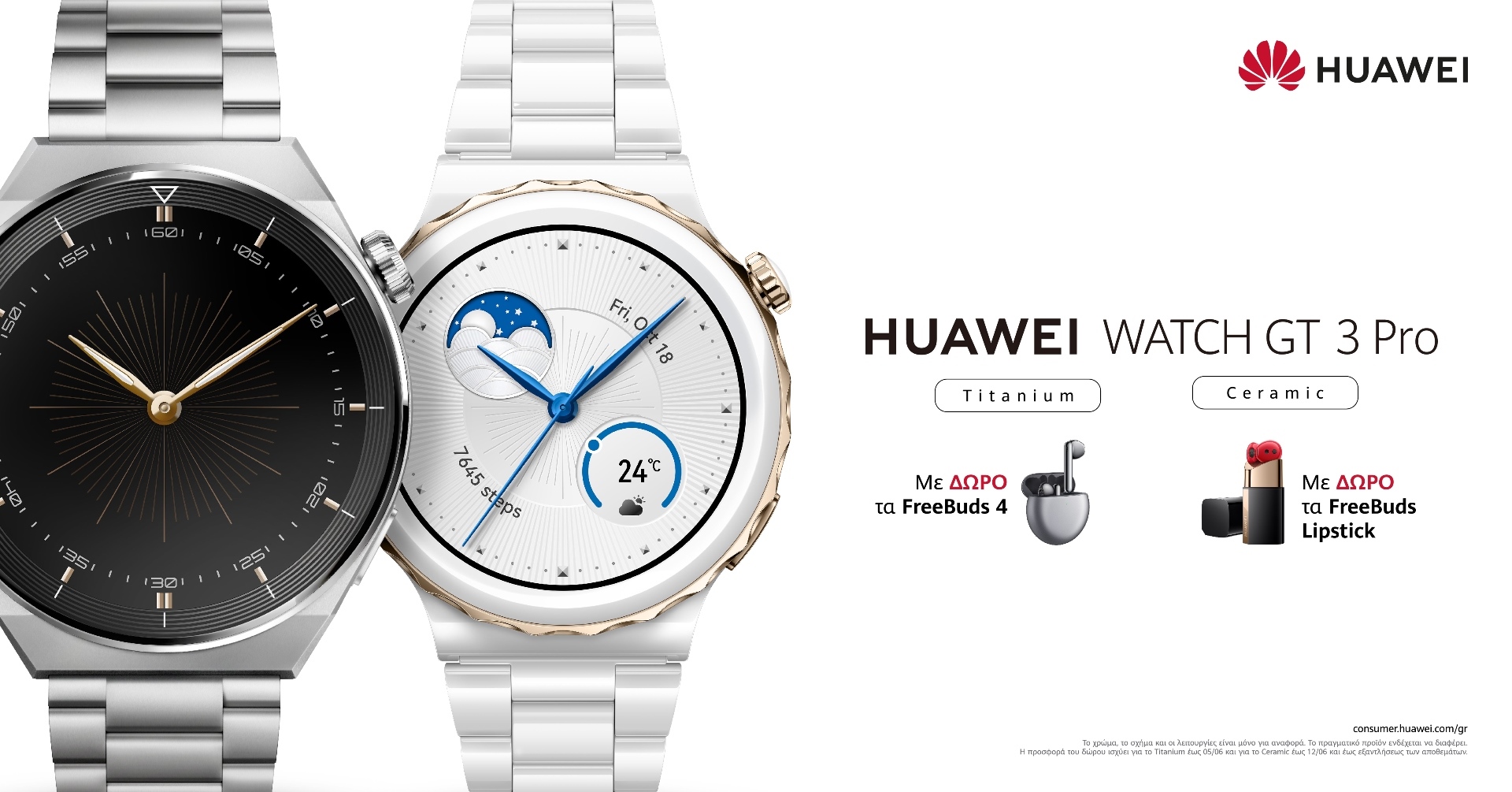 Το HUAWEI WATCH GT 3 Pro Titanium διατίθεται με δώρο το FreeBuds 4 και το HUAWEI WATCH GT 3 Pro Ceramic Edition είναι διαθέσιμο με δώρο το FreeBuds Lipstick από όλο το επίσημο δίκτυο συνεργατών της εταιρείας και στο huaweistore.gr.