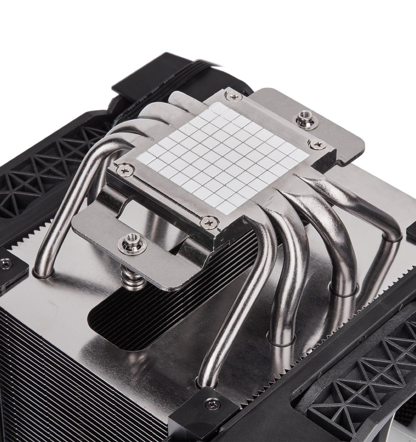 Βλέποντάς το από μακριά μπορεί να νομίζει κανείς ότι είναι δύο ψήκτρες κολλημένες η μια δίπλα στην άλλη, με τους δυο ανεμιστήρες σίγουρα να βοηθάνε να δημιουργηθεί αυτή η εντύπωση. Το παθητικό κομμάτι του συστήματος ψύξης βασίζεται σε μια αλουμινένια βάση από την οποία ξεκινάνε τέσσερα χάλκινα heatpipes προς δυο κατευθύνσεις, τα οποία διασχίζουν το σύνολο των αλουμινένιων fins που καθορίζουν την υπόλοιπη ψήκτρα. Στη κορυφή της ψήκτρας υπάρχει ένα καπάκι που αφαιρείται και το οποίο δίνει πρόσβαση στις δυο βίδες που χρησιμοποιούνται για να στηριχθεί η ψήκτρα πάνω στη βάση, με το κατσαβίδι της συσκευασίας να έχει το κατάλληλο μήκος ώστε να φτάνει σε αυτές τις βίδες. Όπως αναφέραμε και νωρίτερα, η A500 διαθέτει δυο ανεμιστήρες τοποθετημένους -προφανώς- σε διάταξη push pull, δηλαδή ο ένας «ρουφάει» φρέσκο αέρα που περνάει μέσα από τα ζεστά fins για να τα δροσίσει, ενώ ο άλλος απομακρύνει το θερμό αέρα που έχει δημιουργηθεί ανάμεσα στα fins. Προφανώς για να μπορέσει το σύστημα να είναι αποδοτικό, πρέπει να γίνει σωστή τοποθέτηση μέσα στο κουτί σε συνδυασμό και με τους υπόλοιπους ανεμιστήρες που είναι εγκατεστημένοι.