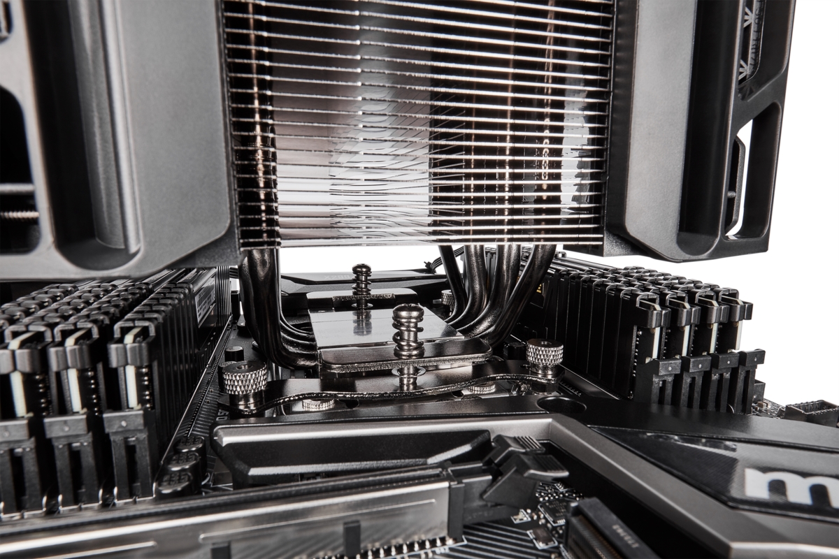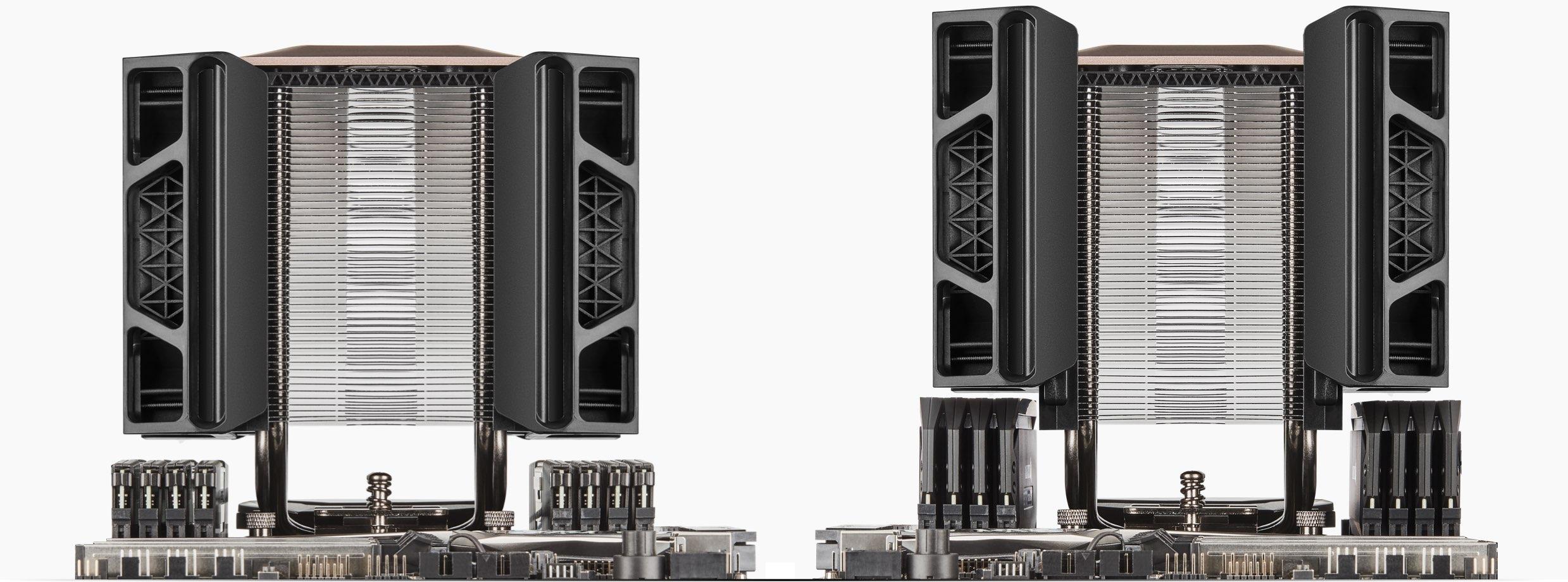Οι δυο ανεμιστήρες έχουν διάμετρο 120mm και καθένας από τους δυο διαθέτει το δικό του καλώδιο με τετράπινο βύσμα σύνδεσης, κάτι που σημαίνει πως μπορεί να υπάρχει πλήρης έλεγχος από το εκάστοτε mainboard. Οι ανεμιστήρες μπορούν να ρυθμιστούν σε ταχύτητα περιστροφής από 400 έως 2400 RPM, ενώ έχουν ικανότητα για μετακίνηση αέρα 75 CFM (κυβικά μέτρα αέρα ανά λεπτό για όσους δε γνωρίζουν τη συντομογραφία). Το μεγάλο όμως και βασικότερο πλεονέκτημα που διαθέτουν οι ανεμιστήρες είναι το γεγονός ότι μπορούν να ανασηκωθούν (ακόμα και να αφαιρεθούν) συρταρωτά, κάνοντας χώρο από κάτω τους. Με αυτό τον τρόπο, ο χρήστης μπορεί να τοποθετήσει ακόμα και μεγάλα σε ύψος DIMM μνήμης, τα οποία θα έβρισκαν πάνω στους ανεμιστήρες αν δεν υπήρχε αυτή η δυνατότητα. Και ακριβώς επειδή πλέον τα DIMM μνήμης έχουν συνήθως ύψος (για να ενσωματώσουν φωτισμό LED), αυτή η δυνατότητα των ανεμιστήρων μπορεί να φανεί εξαιρετικά χρήσιμη, είτε ανασηκώνοντας τον ένα ή και τους δυο ανεμιστήρες.
