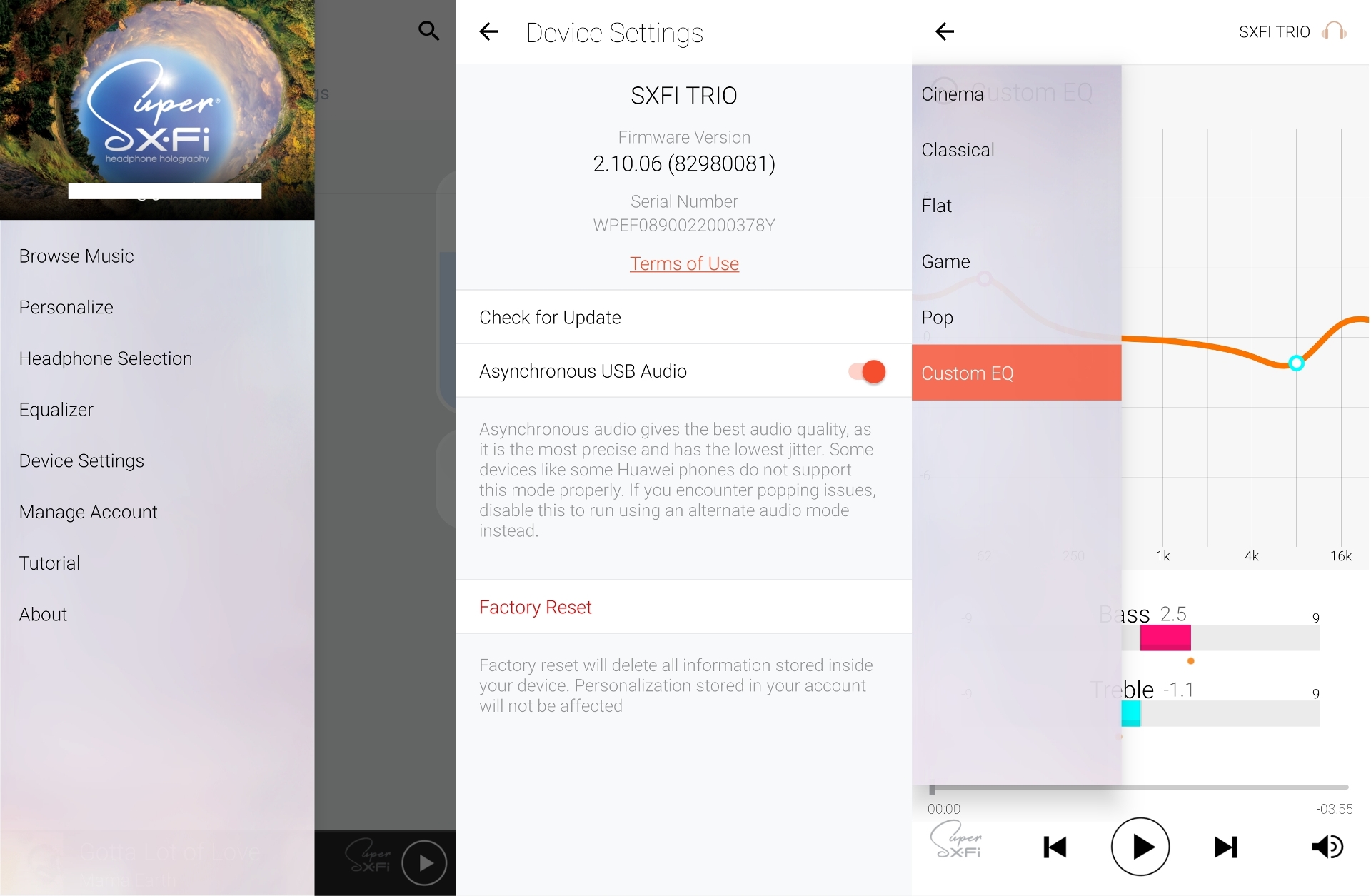 Με το που συνδέσουμε τα ακουστικά σε ένα smartphone (τα δοκιμάσαμε σε Android συσκευή, Xiaomi Mi 10 Pro), αυτά αναγνωρίζονται άμεσα σαν USB συσκευή με κάθε ήχο να μεταφέρεται άμεσα σε αυτά. Μάλιστα, επειδή ακριβώς έχουν δικό τους DAC και ενισχυτή, προσφέρουν ξεχωριστή ρύθμιση έντασης από αυτή που προσφέρει το κινητό, οπότε κάποιος μπορεί να έχει την ένταση στο κινητό ρυθμισμένη πχ στο 50%, και από εκεί και πέρα να ρυθμίζει την ένταση των ίδιον των ακουστικών από τα αντίστοιχα πλήκτρα. Υπάρχουν δυο ακόμα πλήκτρα, με το ένα να λειτουργεί σαν play/pause ή για τον έλεγχο κλήσης, ενώ το δεύτερο ενεργοποιεί τη τεχνολογία Super X-FI, με ένα μικρό led να αλλάζει χρώμα (πράσινο/κόκκινο) ανάλογα με το αν είναι ή όχι ενεργοποιημένη. Για καλύτερο έλεγχό των ακουστικών, καλό είναι να κατεβάσει κανείς το SXFI App στο smartphone του. Δεν είναι απαραίτητο, αλλά δίνει μεγαλύτερο έλεγχο ενώ μέσω αυτής γίνεται και το head mapping για καλύτερη αξιοποίηση της τεχνολογίας Super X-FI. Συγκεκριμένα, πρόκειται για τεχνολογία virtual surround, ώστε να μπορεί να δώσει μια αίσθηση 7.1 ήχου, από ένα τυπικό στερεοφωνικό σύστημα ήχου.