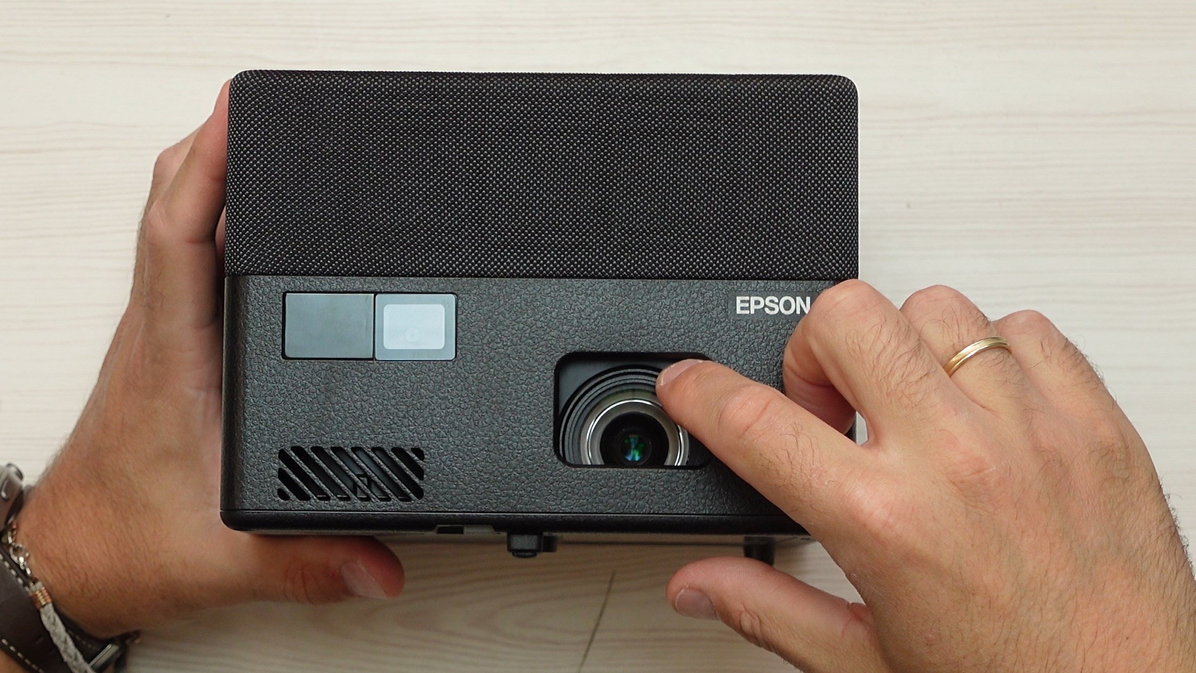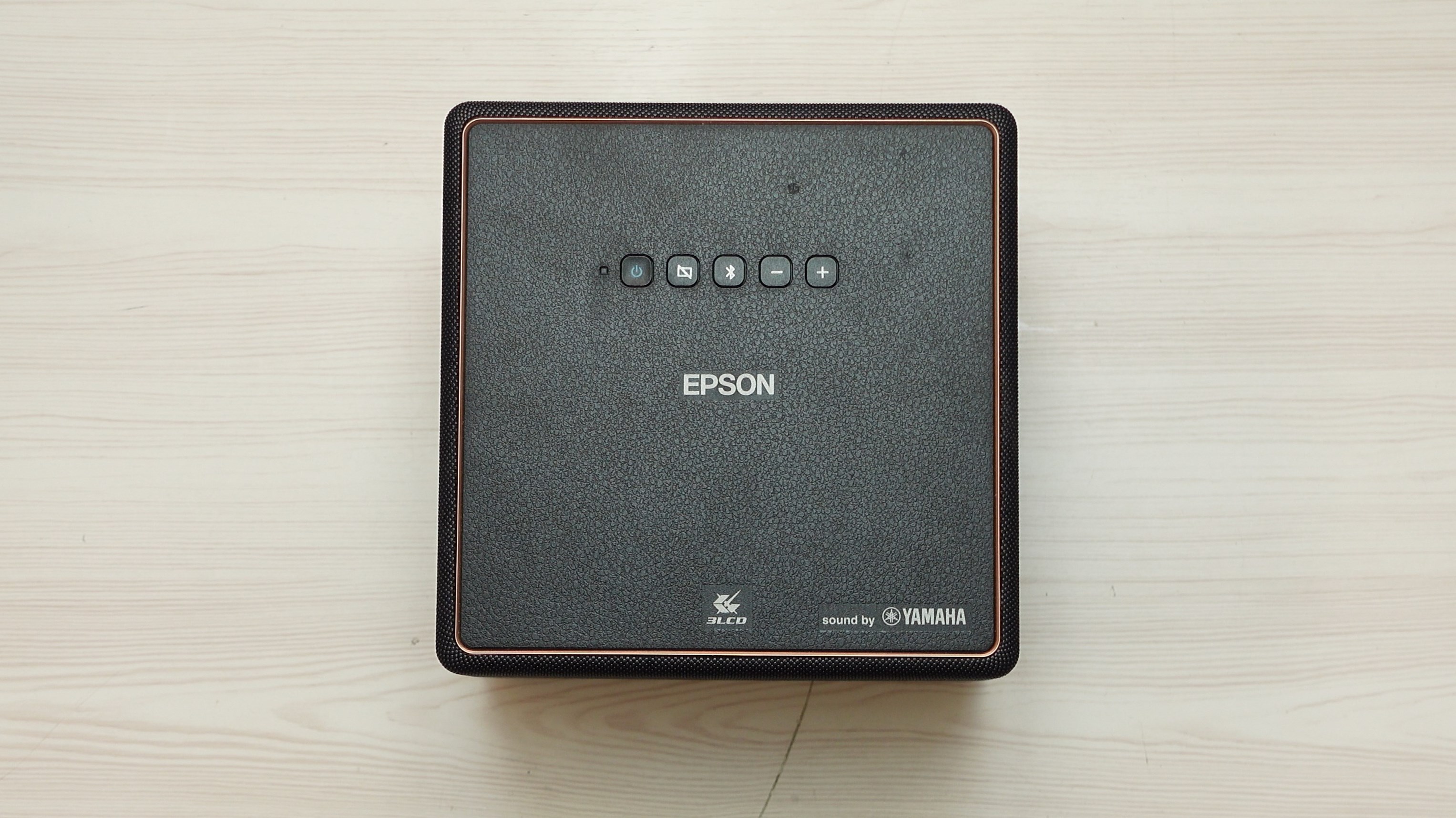 Στην πρόσοψή του υπάρχει ο φακός του συστήματος προβολής χωρίς κάποιο κάλυμμα, ο οποίος όμως είναι σταθερός. Αυτό σημαίνει πως δε μπορεί κανείς να μεγαλώσει ή να μικρύνει το μέγεθος της οθόνης προβολής με κανένα άλλο τρόπο, παρά μόνο απομακρύνοντας τον ή φέρνοντας τον ποιο κοντά στην οθόνη προβολής (ή το τοίχο). Στο κάτω μέρος της πρόσοψης υπάρχει ένα ποδαράκι για να ρυθμίσουμε το ύψος του προβολέα. Στο πάνω μέρος του βρίσκουμε διάφορα πλήκτρα ελέγχου όπως το power, αυξομείωση της έντασης ήχου, keystone correction αλλά και ένα πλήκτρο Bluetooth. Το τελευταίο ουσιαστικά μετατρέπει το προβολέα σε ηχείο Bluetooth, καθώς ενσωματώνει ένα ηχοσύστημα της Yamaha (2x5 watt), το οποίο από τη μια μπορεί κανείς να χρησιμοποιήσει για να ακούει ήχο που παράγεται κατά τη χρήση της συσκευής σαν προβολέας και από την άλλη σαν ένα ασύρματο ηχείο. Στην αριστερή πλευρά της πρόσοψης έχουμε ένα αεραγωγό που βοηθάει στη ψύξη του προβολέα ενώ στη δεξιά βρίσκουμε ένα μικρό καπάκι πίσω από το οποίο συναντάμε ένα φίλτρο σκόνης, ώστε το εσωτερικό του προβολέα να παραμένει καθαρό ακόμα και μετά από πολλές ώρες χρήσης του (και αντίστοιχα χρήσης του ανεμιστήρα ψύξης).