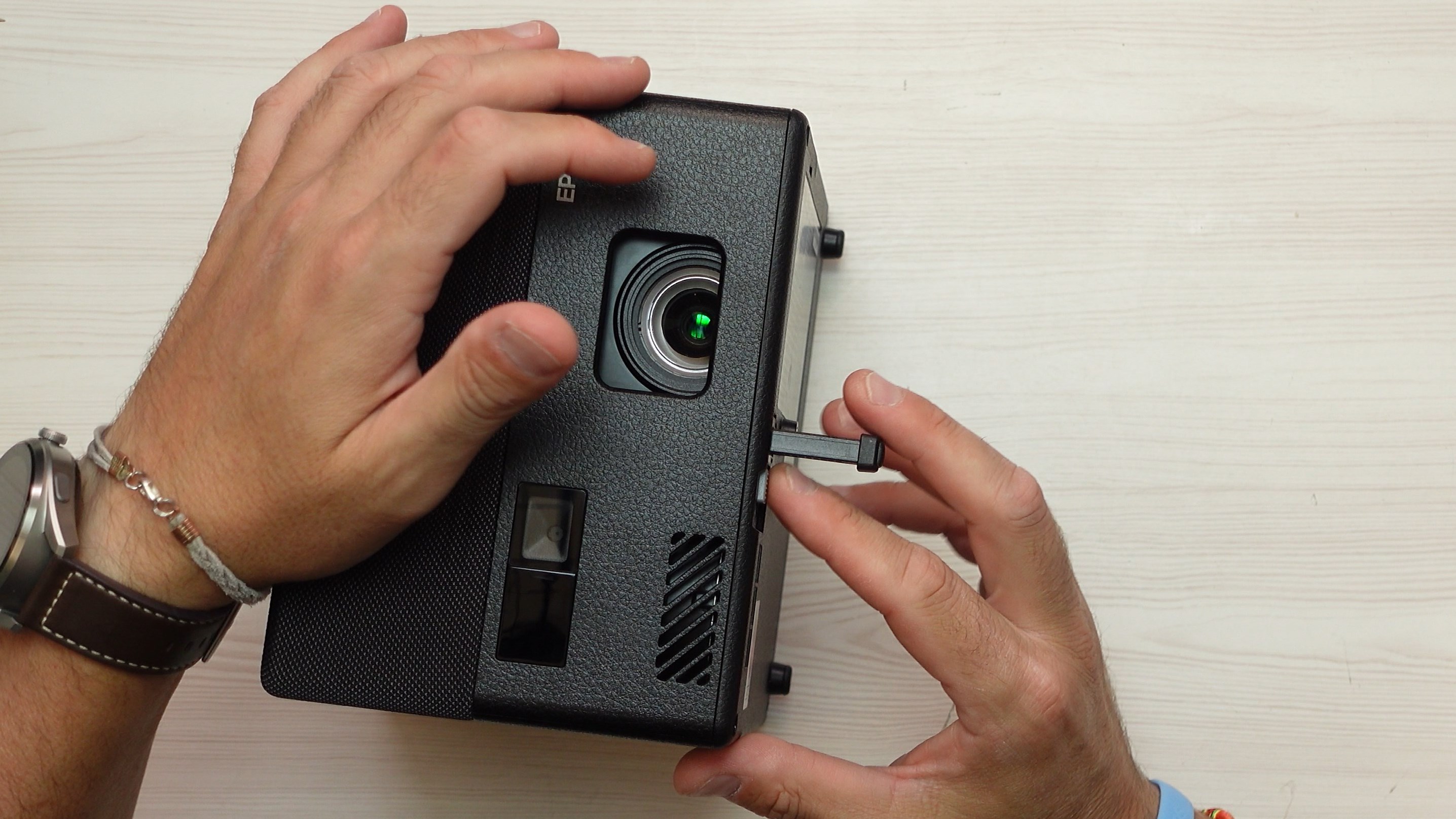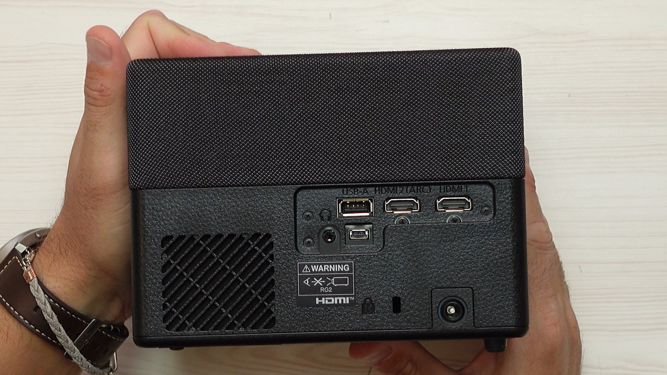 Στο πίσω μέρος έχουμε όλες τις θύρες σύνδεσης και συγκεκριμένα 2 HDMI εκ των οποίων η μια ARC, πια παραδοσιακή USB για σύνδεση δίσκου/usb flash drive καθώς και έξοδο ακουστικών. Το ηχεία έχει ισχύ 10 Watt παίζει πραγματικά καλά αν και σίγουρα αποτελεί μια βασική λύση. Καλύτερα για τον χρήστη να αξιοποιήσει εξωτερικό σύστημα ήχου, με τη λύση Bluetooth ηχείων ή ακουστικών να είναι η ευκολότερη. Η σύνδεση γίνεται άνετα χάρη στο λειτουργικό Android TV που έχει εγκατεστημένος ο προβολέας (περισσότερα για αυτό σε λίγο) . Στη πίσω πλευρά βρίσκεται και η τροφοδοσία.