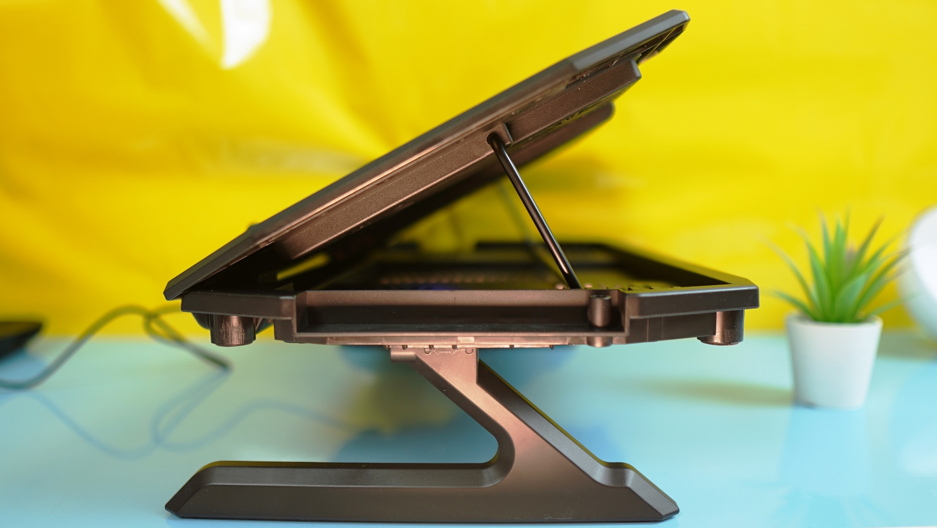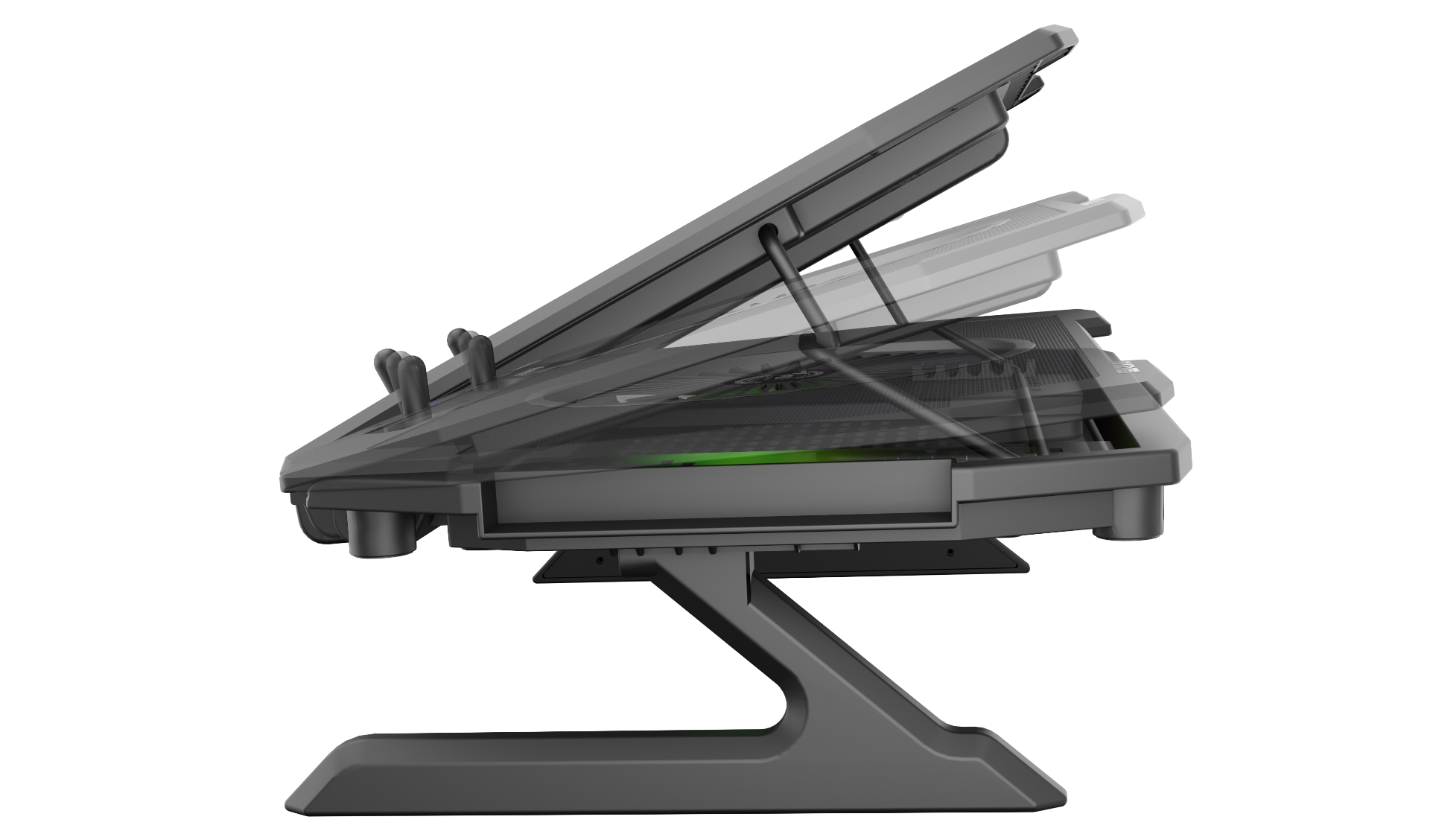 Σε αυτή τη περίπτωση βέβαια, το πληκτρολόγιο του laptop είναι σχεδόν αδύνατο να χρησιμοποιηθεί, όμως η οθόνη του laptop έρχεται σε περισσότερη φυσική θέση απέναντι από τα μάτια μας. Όσοι θελήσουν να χρησιμοποιήσουν τα ποδαράκια, θα πρέπει να έχουν πρόχειρο πληκτρολόγιο και ποντίκι καθώς τα ενσωματωμένα στο laptop δε μπορούν να χρησιμοποιηθούν. Όμως θα έχουν σίγουρα καλύτερο airflow καθώς υπάρχει άπλετος χώρος κάτω από τη βάση (και κατ’ επέκταση το laptop).