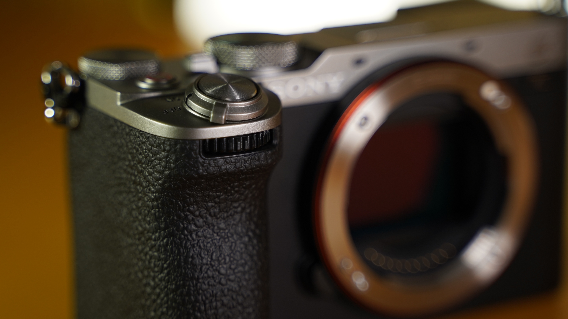 Στη πρόσοψη και προς τα πάνω της λαβής έχουμε το ρυθμιστικό που αφορά την αλλαγή της τιμής του διαφράγματος ενώ στο πάνω μέρος βρίσκεται το πλήκτρο για το κλείστρο παρέα με το διακόπτη on-off.
