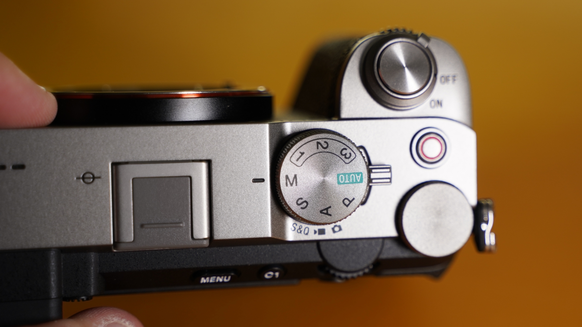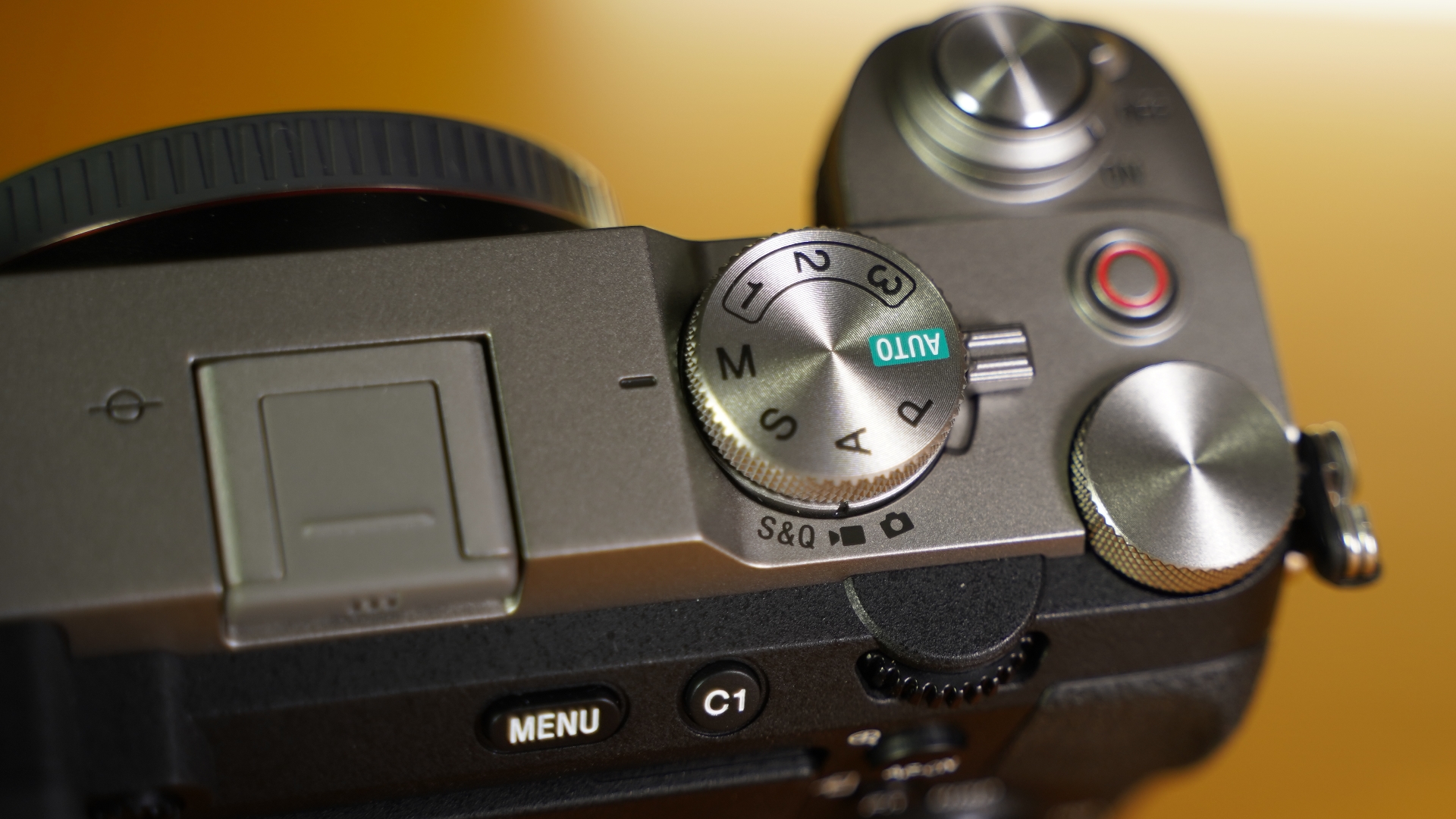 Στη πάνω πλευρά της μηχανής έχουμε περισσότερα πλήκτρα ελέγχου και ρυθμίσεων, όπως το μικρό κόκκινο για την έναρξη της εγγραφής βίντεο, τη ροδέλα ελέγχου της ταχύτητας κλείστρου και τη βασική ροδέλα επιλογής mode μεταξύ P/A/S/M/Auto καθώς και των 1/2/3 που είναι πλήρως προγραμματιζόμενα. Κάτω από τη ροδέλα αυτή υπάρχει ένα διακόπτης τριών θέσεων για να διαλέξουμε τι θα κάνει η μηχανή: φωτογραφία, βίντεο και slow motion βίντεο. Επίσης, στη πάνω πλευρά υπάρχει και το socket για τη τοποθέτηση εξωτερικών φλας (η μηχανή δεν έχει δικό της φλας) ή και μικροφώνων, υποστηρίζοντας και όλα τα πρόσφατα μικρόφωνα της Sony.