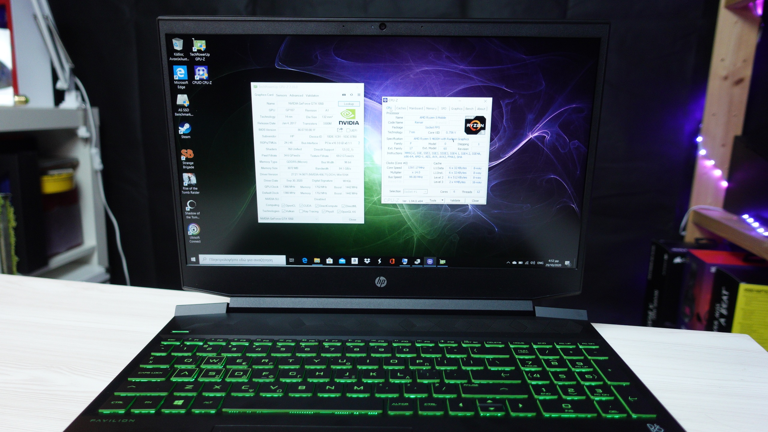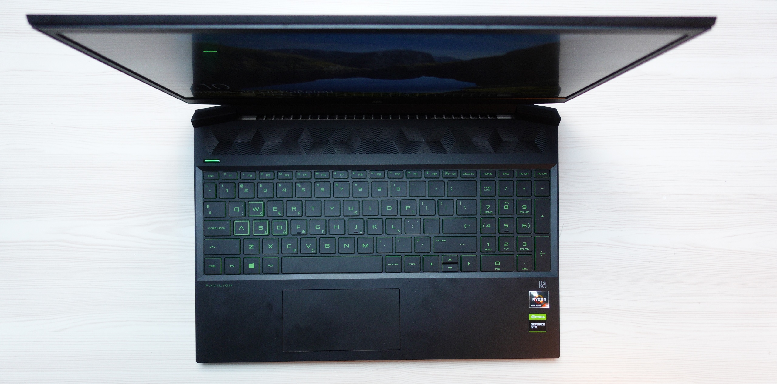 Σε επίπεδο hardware τώρα, το Pavilion της δοκιμής προσπαθεί να ισορροπήσει μεταξύ καλών επιδόσεων και χαμηλής τιμής. Το κύριο πλεονέκτημά του είναι ο επεξεργαστής τους, ένα ολοκαίνουριος AMD Ryzen 5 4600H με 6 πυρήνες και 12 threads. Πρόκειται για επεξεργαστή αρχιτεκτονικής Zen 2, που ουσιαστικά κυκλοφορεί αποκλειστικά για laptop και προσφέρει μέγιστη συχνότητα λειτουργίας τα 3Ghz ενώ μπορεί να φτάσει ακόμα και στα 4Ghz μέσω boost. Πραγματικά, προσφέρει εντυπωσιακές επιδόσεις αν αναλογιστεί κανείς πως δοκιμάζοντας το Cinebench 20, μας έδωσε αποτέλεσμα αντίστοιχο με αυτό που δίνει ένας 8πύρηνος με 16 threads Ryzen 7 1700X και συγκεκριμένα 3308 μονάδες CPU score! Ο συγκεκριμένος επεξεργαστής δε πρόκειται να απογοητεύσει κανένα, είτε παίζει παιχνίδια είτε ασχολείται με απαιτητικές εφαρμογές όπως επεξεργασία βίντεο και φωτογραφιών ή βαρύ multitasking. Το CPU έρχεται και με ενσωματωμένο υποσύστημα γραφικών Radeon, το οποίο αξιοποιείται από τον υπολογιστή όταν ο χρήστης δε παίζει παιχνίδια. Με αυτό τον τρόπο το σύστημα μπορεί να αυξήσει σημαντικά την αυτονομία του, η οποία ανάλογα με τη χρήση μπορεί να ξεπεράσει και τις 8 ώρες. Από εκεί και πέρα, βρίσκουμε ένα μέτριας ταχύτητας NVMe δίσκο χωρητικότητας 256GB, ο οποίος είναι μάλλον μικρός καθώς εγκαθιστώντας 5 παιχνίδια για τις ανάγκες των δοκιμών, όχι μόνο γέμισε αλλά στη πραγματικότητα ταυτόχρονα χώρεσαν 4 παιχνίδια.