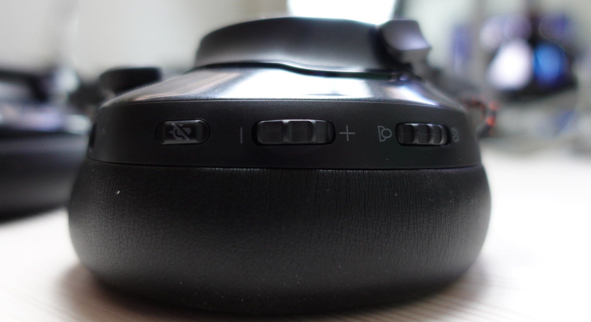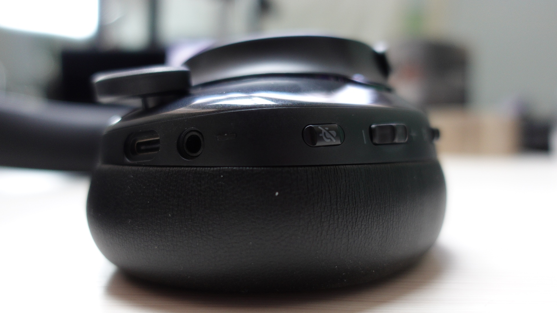 Στο αριστερό ακουστικό συναντάμε τη ροδέλα αυξομείωσης έντασης ήχου, ένα πλήκτρο ενεργοποίησης/απενεργοποίησης του μικροφώνου, ένα δεύτερο ρυθμιστικό το οποίο αυξομειώνει την ένταση ήχου του παιχνιδιού ή του chat, όταν ο χρήστης κάνει on line συνομιλία, μια θύρα USB Type-C για τη φόρτιση των ακουστικών και την είσοδο mini jack για τη χρήση των ακουστικών ενσύρματα (και αναλογικά). Επίσης, στο αριστερό ακουστικό βρίσκεται και το μικρόφωνο, το οποίο στην άκρη του έχει ένα led φως ώστε να γνωρίζουμε αν είναι ενεργό ή όχι.