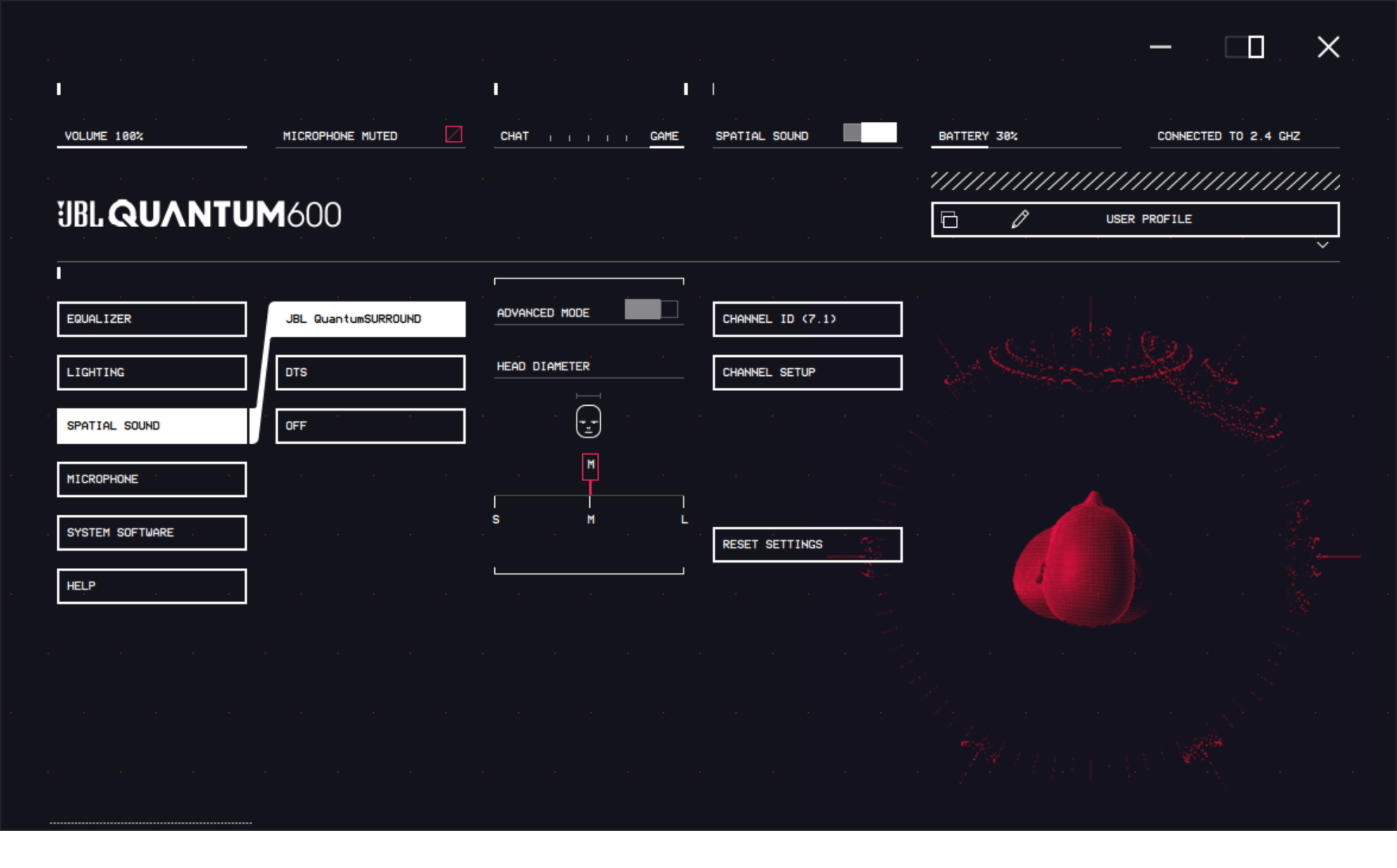 Το ίδιο το app προσφέρει διάφορες επιλογές, όπως δυνατότητα ρύθμισης του equalizer, ρύθμιση για το φωτισμό LED που έχουν τα λογότυπα στα δυο ακουστικά και το κυριότερο, ενεργοποίηση είτε του Dolby X 2.0 (for Headphones) είτε του JBL QuantumSurround, το οποίο είναι η λειτουργία 7,1 ήχου που προσφέρει το headset. Στο σημείο αυτό πρέπει να σημειώσουμε πως αν τα ακουστικά είναι συνδεδεμένα με mini jack προφανώς δε μπορεί κανείς να λειτουργήσει κάτι από τα παραπάνω, ενώ ακόμα και στη περίπτωση του PS4, τα ακουστικά μπορεί να λειτουργούν ασύρματα, αλλά μόνο με στερεοφωνικό ήχο. Η ασύρματη σύνδεση με το usb dongle λειτουργεί στα 2,4Ghz και σε γενικές γραμμές δε παρατηρήσαμε προβλήματα συνδεσιμότητας σε ένα τυπικό χώρο σπιτιού. Από εκεί και πέρα, όσον αφορά στον ήχο, τα ακουστικά έχουν τονισμένες με το παραπάνω τις χαμηλές συχνότητες, προσφέροντας δυνατό μπάσο. Η μέγιστη ένταση των ακουστικών είναι απλά ικανοποιητική, ενώ αξίζει να σημειώσουμε πως το ρυθμιστικό έντασης των ακουστικών λειτουργεί διαφορετικά από τη ρύθμιση έντασης των Windows, οπότε όποιος θέλει τη μέγιστη ένταση, χρειάζεται να έχει και τα Windows στο 100. Όσον αφορά στο πολυκάναλο ήχο, τα Quantum 600 αποδίδουν αρκετά καλά τις περιβάλλοντες ήχους στα διάφορα παιχνίδια, δίνοντας μια σαφή αίσθηση από πού προέρχεται ο κάθε ήχος. Μια αδυναμία στο πως ακούγονται οι φωνές παρατηρήσαμε, καθώς αυτές έχουν μια φανερή ηχώ για κάποιο λόγο, αλλά όχι πάντα και όχι σε όλα τα παιχνίδια.