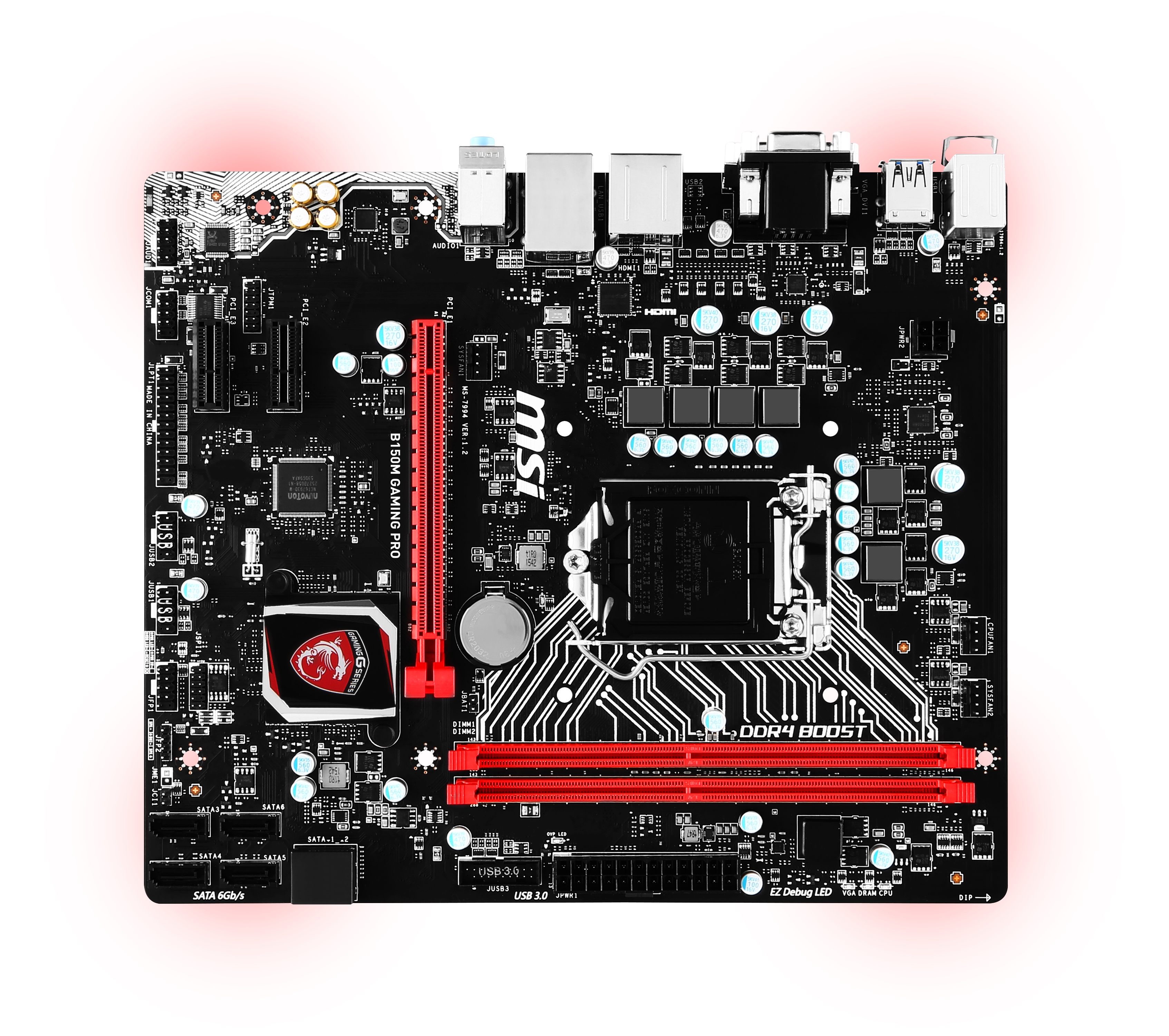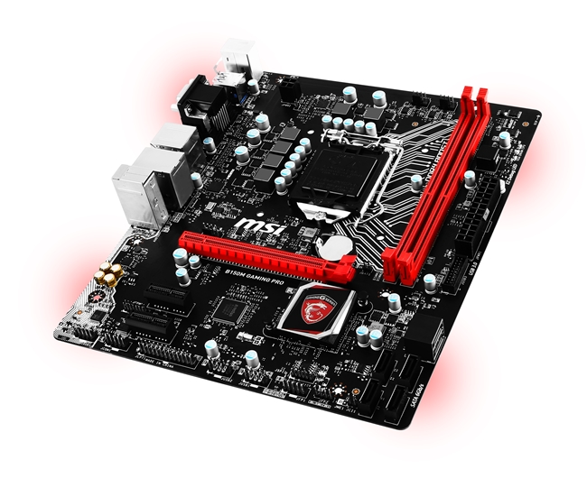 Πηγαίνοντας στο ίδιο το board τώρα, έχουμε να κάνουμε με ένα όμορφο microATX μοντέλο, το οποίο χρωματικά ακολουθεί τη φιλοσοφία της εταιρείας, με το μαύρο να κυριαρχεί και το κόκκινο στη PCI-E και τις θέσεις μνήμης να δίνει ένα εντυπωσιακό τόνο. Χρωματικά, η ASUS έχει επιλέξει το μαύρο σαν κύριο χρώμα με κάποιες κόκκινες πινελιές πάνω στα συστήματα ψύξης. Κόκκινα LED υπάρχουν επίσης στο κάτω μέρος τα οποία γεμίζουν με αντίστοιχου χρώματος φως το case, ενώ τρια ενημερωτικά κόκκινα LED (EZ Debug LED τα λέει η MSI) από τη μια φωτίζουν αντίστοιχα και από την άλλη ενημερώνουν για τυχόν προβλήματα. Κάτι άλλο που συναντάμε είναι το DDR4 boost, το οποίο το έχουμε δει και σε ακριβότερα board της MSI. Πρόκειται για μια ειδική σύνδεση μεταξύ των -μόνο δυο είναι η αλήθεια- DIMM DDR4 και του socket του επεξεργαστή (στον οποίο ενσωματώνεται ο ελεγκτής μνήμης), ώστε οι μνήμες να αποδίδουν καλύτερα. Αυτή η σύνδεση είναι εμφανής χάρη στις λευκές γραμμές που βρίσκονται στο PCB, ανάμεσα στα Dimm και CPU socket. Η εταιρεία έχει ενσωματώσει μια θύρα PCI Express πλήθους μήκους x16 ενώ υπάρχουν επίσης δυο ακόμα μήκους x1. Δυστυχώς λείπει κάποια θύρα Μ.2 για να μπορέσουμε να τοποθετήσουμε αντίστοιχο δίσκο flash, οπότε υποχρεωτικά ο χρήστης θα αξιοποιήσει κάποια ή κάποιες από τις 6 θύρες SATA 3.