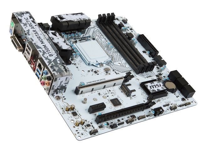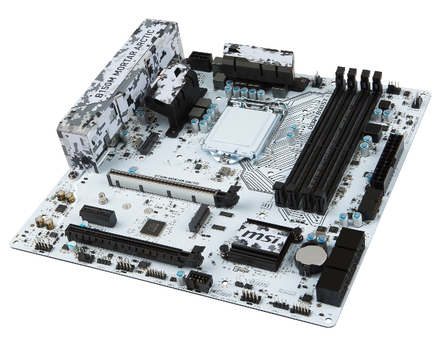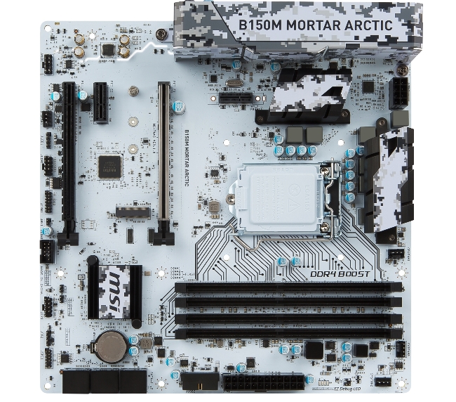 Το B150 Mortar Arctic βασίζεται σε αυτό, διαθέτει κάποια ενδιαφέροντα χαρακτηριστικά και ξεχωριστή εμφάνιση. Πρόκειται για ένα micro ATX board που έρχεται σε μια συσκευασία με τα απαραίτητα manual και καλώδια. Χρωματικά διαφοροποιείται από τη συνήθη κοκκινόμαυρη εμφάνιση που χρησιμοποιεί η εταιρεία, με το PCB να είναι ολόλευκο και το μαύρο χρώμα να χρησιμοποιείται στις PCI-E θύρες και τις θέσεις μνήμης, προσφέροντας έναν εντυπωσιακό συνδυασμό. Επιπλέον, η εταιρεία έχει εφαρμόσει κάποιες πινελιές παραλλαγής σε διάφορα σημεία, όπως στις ψύκτρες και το κάλυμμα των θυρών σύνδεσης, και έτσι το board αποκτά ένα στρατιωτικό χαρακτήρα. Άλλωστε, και το ίδιο το όνομα προδιαθέτει για κάτι τέτοιο, αφού το Mortar είναι ένα κανόνι. Στο κάτω μέρος του board υπάρχουν Led λευκού χρώματος που γεμίζουν με αντίστοιχου χρώματος φως το case. Επιπλέον, υπάρχει ένα ειδικό header πάνω στο board για σύνδεση led strip (12V), το οποίο μπορούμε να τοποθετήσουμε όπως θέλουμε μέσα στο case, για να ενισχύσουμε το φωτισμό. Στη συσκευασία πάντως δεν υπάρχει κάποιο led strip και ο χρήστης πρέπει να το προμηθευτεί ξεχωριστά.