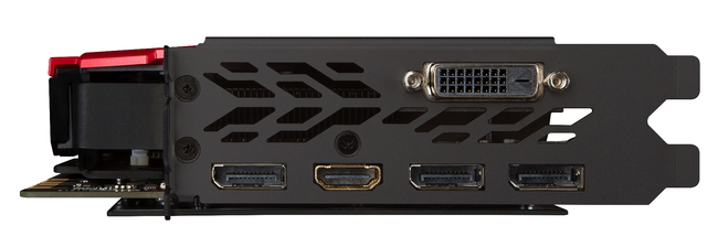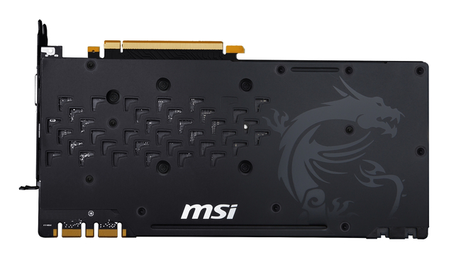 Το μήκος της είναι αρκετά μεγάλο, κάτι που πρέπει να προσέξει κανείς για να σιγουρευτεί ότι χωράει στο κουτί του, με το PCB της να ειναι σχεδιασμένο από την MSI, έχοντας 10 layers και χρησιμοποιώντας υλικά επιπέδου Military Class 4. Στο πίσω μέρος της κάρτας βρίσκουμε τις εξόδους εικόνας, πέντε στο σύνολο, με μια DVI, μια HDMI 2.0b και τρεις Display Port 1.4, με τη κάρτα να μπορεί να οδηγήσει ταυτόχρονα έως τέσσερις οθόνες. Αξίζει επίσης να αναφέρουμε πως η πλάτη της καλύπτεται από μια μεταλλική επιφάνεια (backplate), η οποία προσφέρει αυξημένη στιβαρότητα και προστασία, από πλευράς εισόδων τροφοδοσίας διαθέτει μια 8πινη και μια 6πινη, ενώ επίσης βρίσκουμε και δυο SLI connectors, οι οποίοι απαιτούν νέο SLI bridge για να λειτουργήσουν.