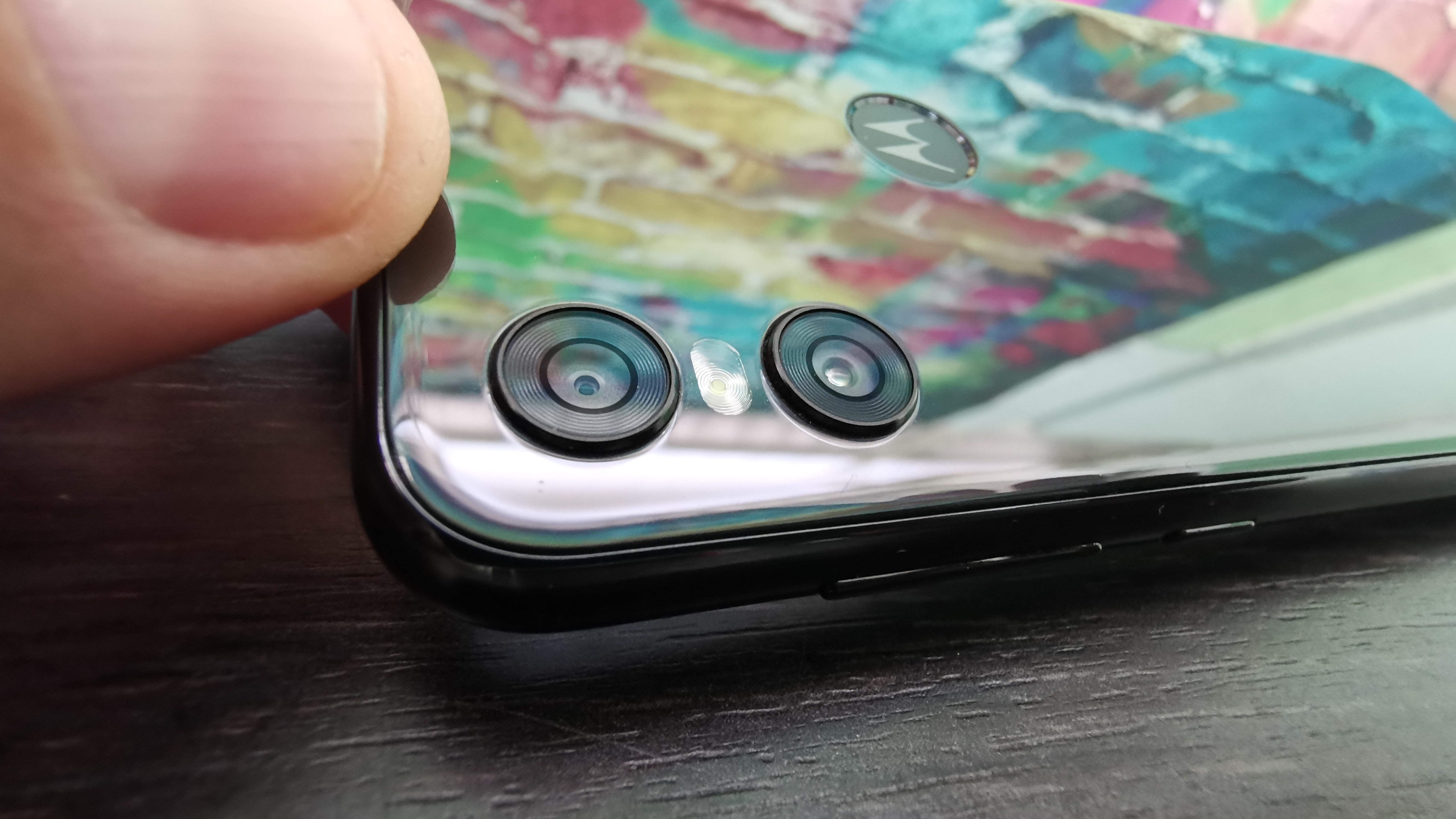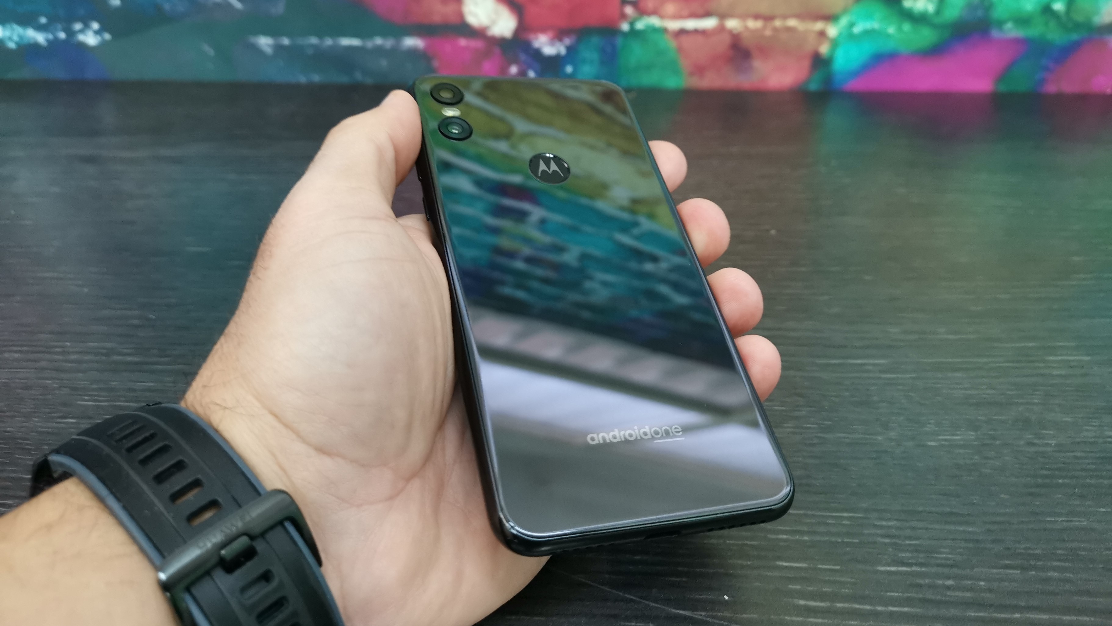Η συσκευή ακολουθεί τη σύγχρονη τάση της οθόνης που καλύπτει το μεγαλύτερο κομμάτι της πρόσοψης, χωρίς άλλα φυσικά πλήκτρα και με την αξιοποίηση εγκοπής στο πάνω μέρος. Στη πραγματικότητα, το Motorola One μοιάζει πάρα πολύ με το Iphone XR, καθώς υπάρχουν περιθώρια και στις τέσσερις πλευρές, με chin στο κάτω μέρος στο οποίο βρίσκεται και το λογότυπο της εταιρείας. Η ύπαρξη περιθωρίων είναι κάτι λογικό, καθώς η οθόνη είναι LCD και έτσι χρειάζεται περισσότερος χώρος για το φωτισμό της. Η εγκοπή ενσωματώνει τη μπροστινή κάμερα των 8MP (f/2.2) παρέα με ένα LED flash, καθώς και το κύριο ακουστικό. Στο πίσω μέρος βρίσκουμε ένα ζευγάρι καμερών , της κύριας των 13MP με f/2.0 και μιας δεύτερης 2MP με f/2.4 που χρησιμεύει αποκλειστικά σαν αισθητήρας βάθους για δημιουργία bokeh effect. Επίσης, στο πίσω μέρος υπάρχει μια στρογγυλή εσοχή με το λογότυπο της Motorola που χρησιμεύει σαν αισθητήρας αναγνώρισης δακτυλικών αποτυπωμάτων.