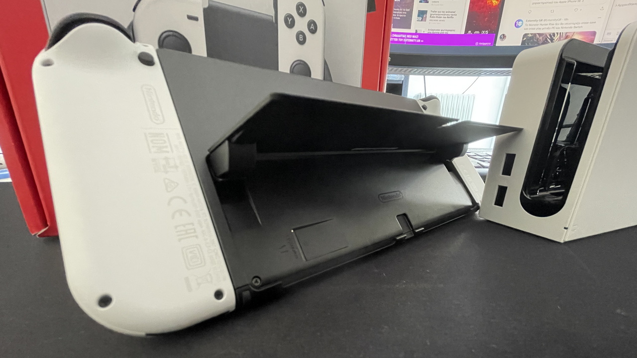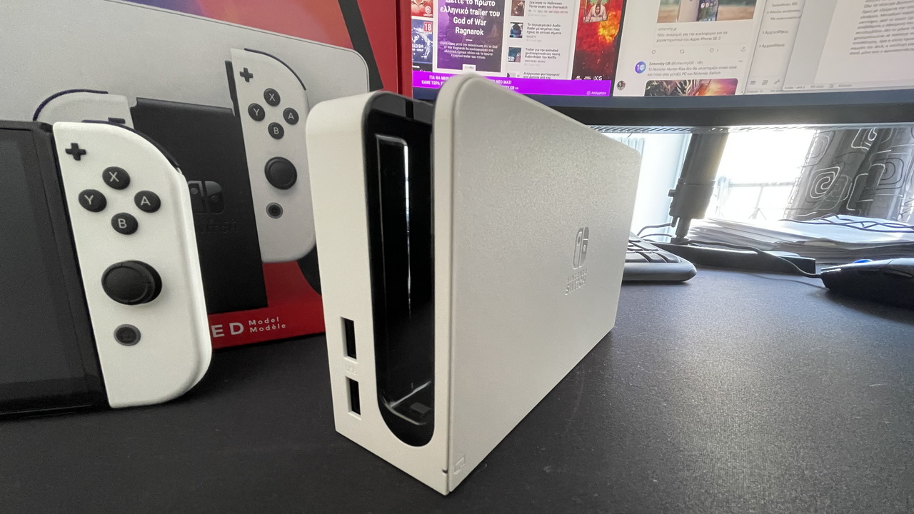 Το dock έχει αλλάξει αρκετά, τόσο εμφανισιακά, όσο και λειτουργικά. Καταρχάς, οι ακμές στο πάνω μέρος του είναι στρογγυλεμένες. Ο χώρος για να τοποθετηθεί η κονσόλα είναι λίγο πιο άνετος όσον αφορά τη μικρότερη διάσταση, με αποτέλεσμα η συσκευή να μην είναι και τόσο σταθερά τοποθετημένη, ενώ βρήκαμε και μια μικρή δυσκολία στο "κεντράρισμά" της στο dock. Από εκεί και πέρα, το πορτάκι μέσω του οποίου ανοίγει το πίσω μέρος είναι αποσπώμενο και όχι με "μηχανισμό" για να ανοιγοκλείνει, όπως συμβαίνει με τον προκάτοχό του. Η συμβατική θύρα USB στο εσωτερικό του έχει αντικατασταθεί από την υποδοχή για καλώδιο LAN. Η νέα δυνατότητα είναι κάτι για το οποίο "φώναζαν" εδώ και πολλά χρόνια οι κάτοχοι κονσολών της Nintendo, που πλέον απαλλάσσονται από την ανάγκη αγοράς επιπλέον adaptor. Έτσι, απλά συνδέοντας ένα καλώδιο δικτύου (πωλείται έξτρα), έχουν άμεση πρόσβαση σε ταχύτερα downloads και πιο σταθερή σύνδεση στο διαδίκτυο, σημαντικό πλεονέκτημα για όσους ασχολούνται με online gaming. Δίπλα της η έξοδος HDMI αλλά και η υποδοχή για τη σύνδεση με παροχή ρεύματος. Στο αριστερό πλάι του dock, παραμένουν οι δύο κλασσικές USB και σημειώνεται ότι είναι απόλυτα συμβατό με το original Nintendo Switch, όπως επίσης και με το V2.