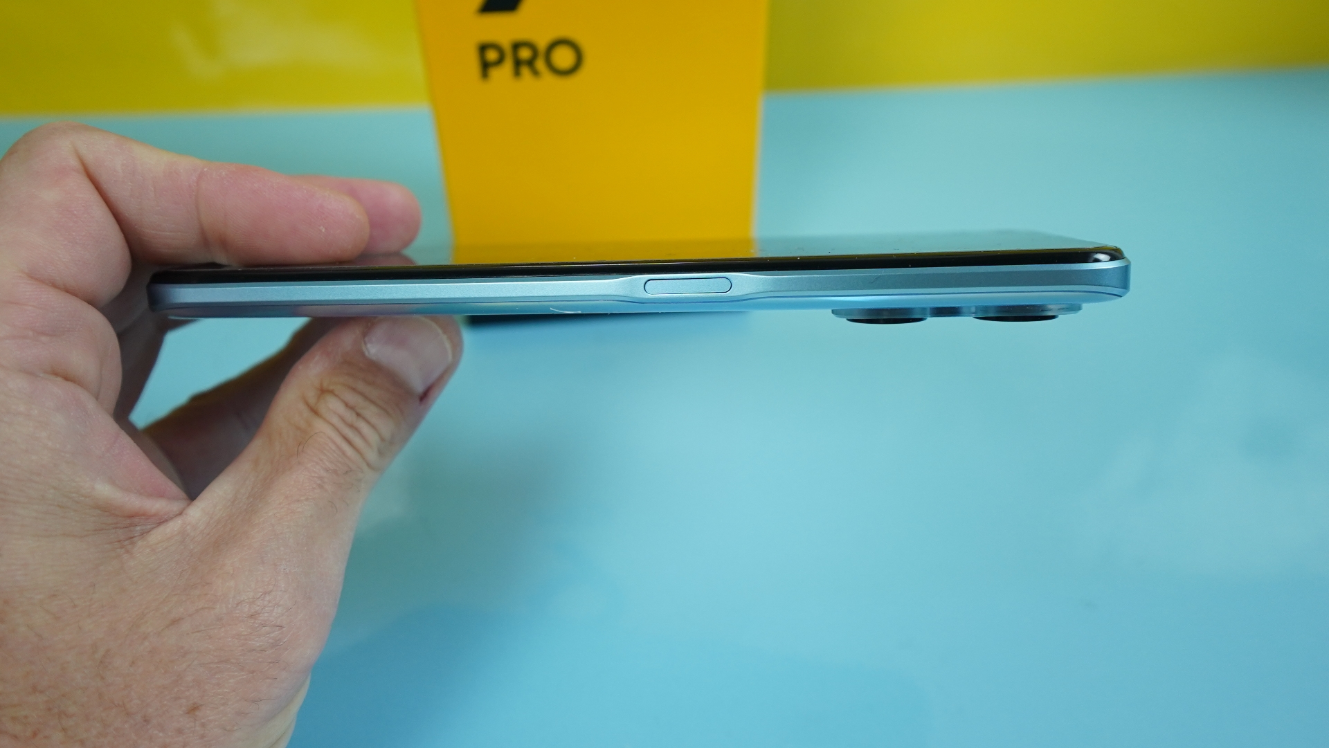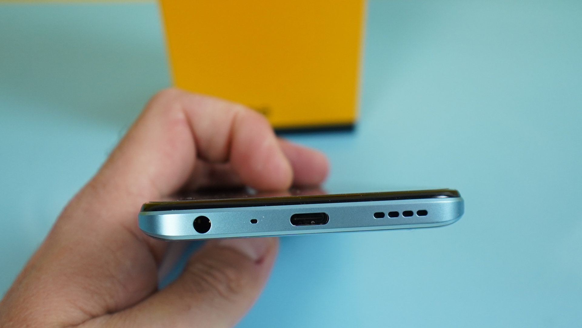 Συνεχίσουμε τη περιήγησή μας στο τηλέφωνο, στη δεξιά πλευρά είναι το power button το οποίο εκτελεί και χρέη αναγνώστη δακτυλικών αποτυπωμάτων. Στην αριστερή πλευρά έχουμε τα volume controls και τη θέση για τοποθέτηση των καρτών sim με το τηλέφωνο να είναι συμβατό με 5G δίκτυα. Επίσης, το tray δέχεται και κάρτες μνήμης microSD, σε αντίθεση με το realme 9 Pro +. Στο κάτω μέρος έχουμε το αξιοπρεπές σε ένταση και ποιότητα ηχείο, έξοδο ακουστικών και τη θύρα Type-C USB. Στη πλάτη συναντάμε και το τριπλό σύστημα καμερών οι οποίες είναι τοποθετημένες μέσα σε ένα παραλληλόγραμμο πλαίσιο, με τις δυο βασικές κάμερες να καταλαμβάνουν το περισσότερο χώρο και τη τρίτη με το led flash να βρίσκονται στο πλάι.