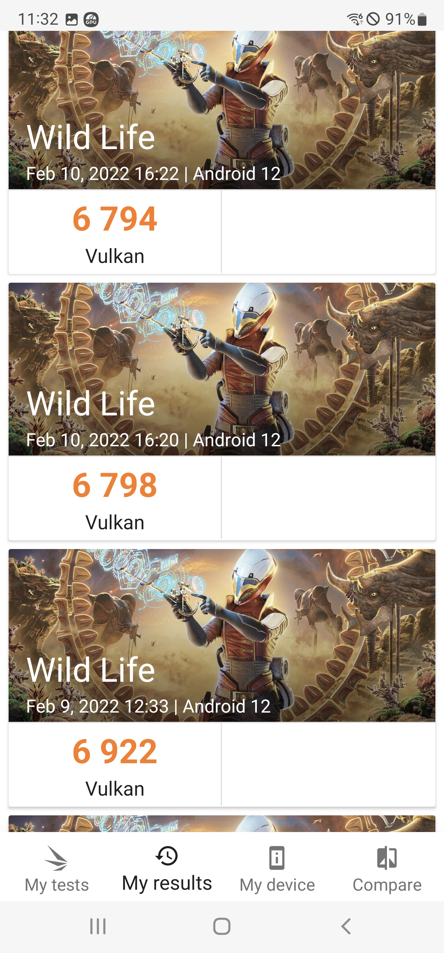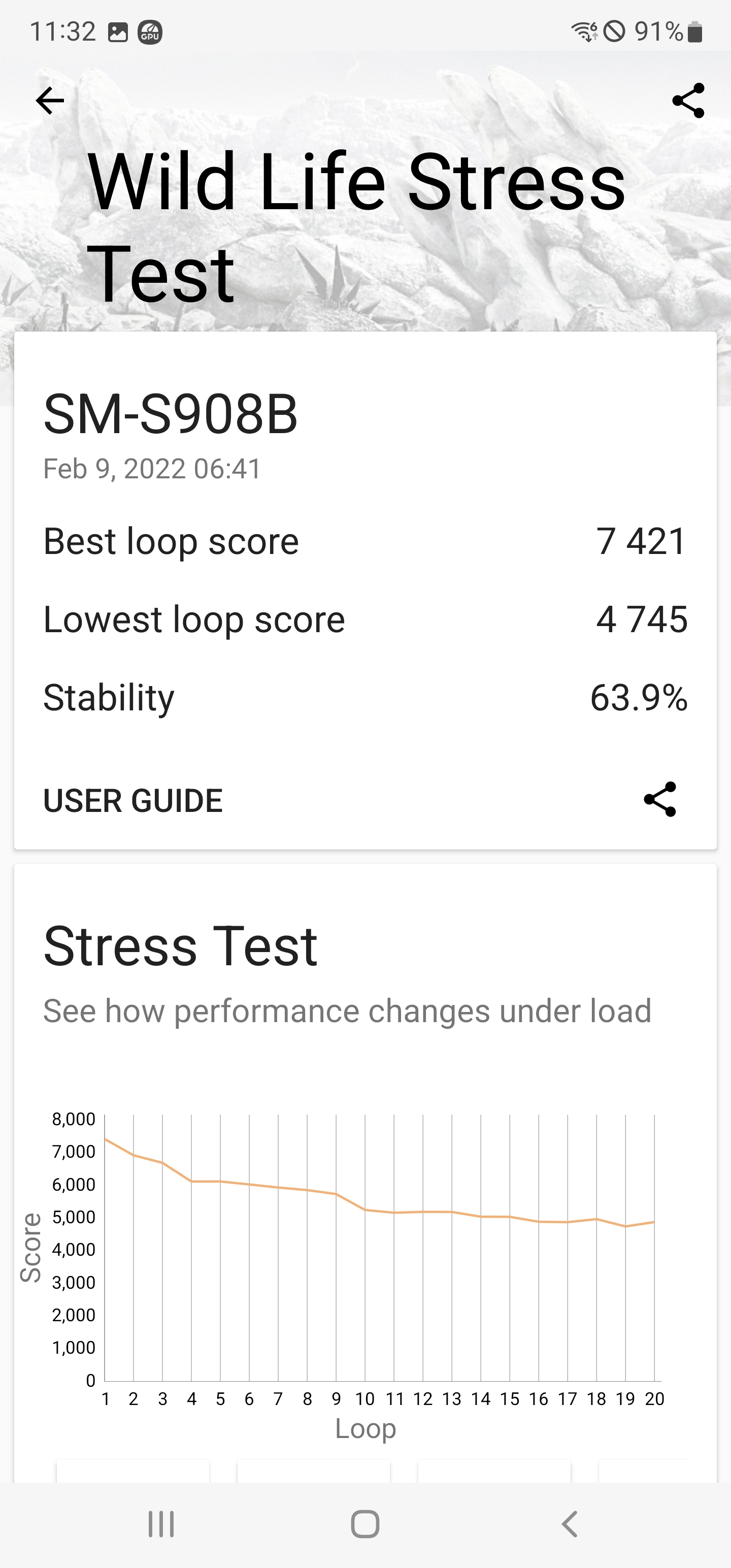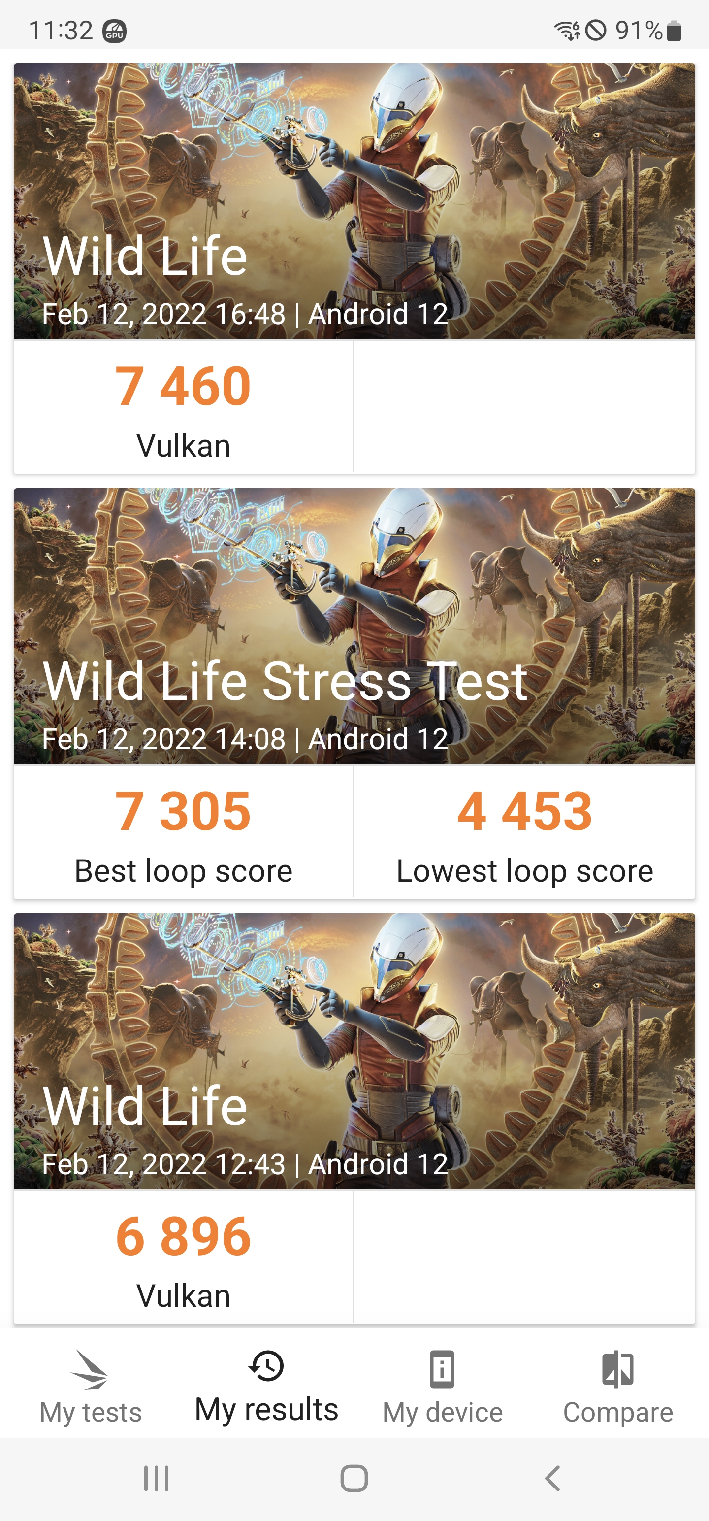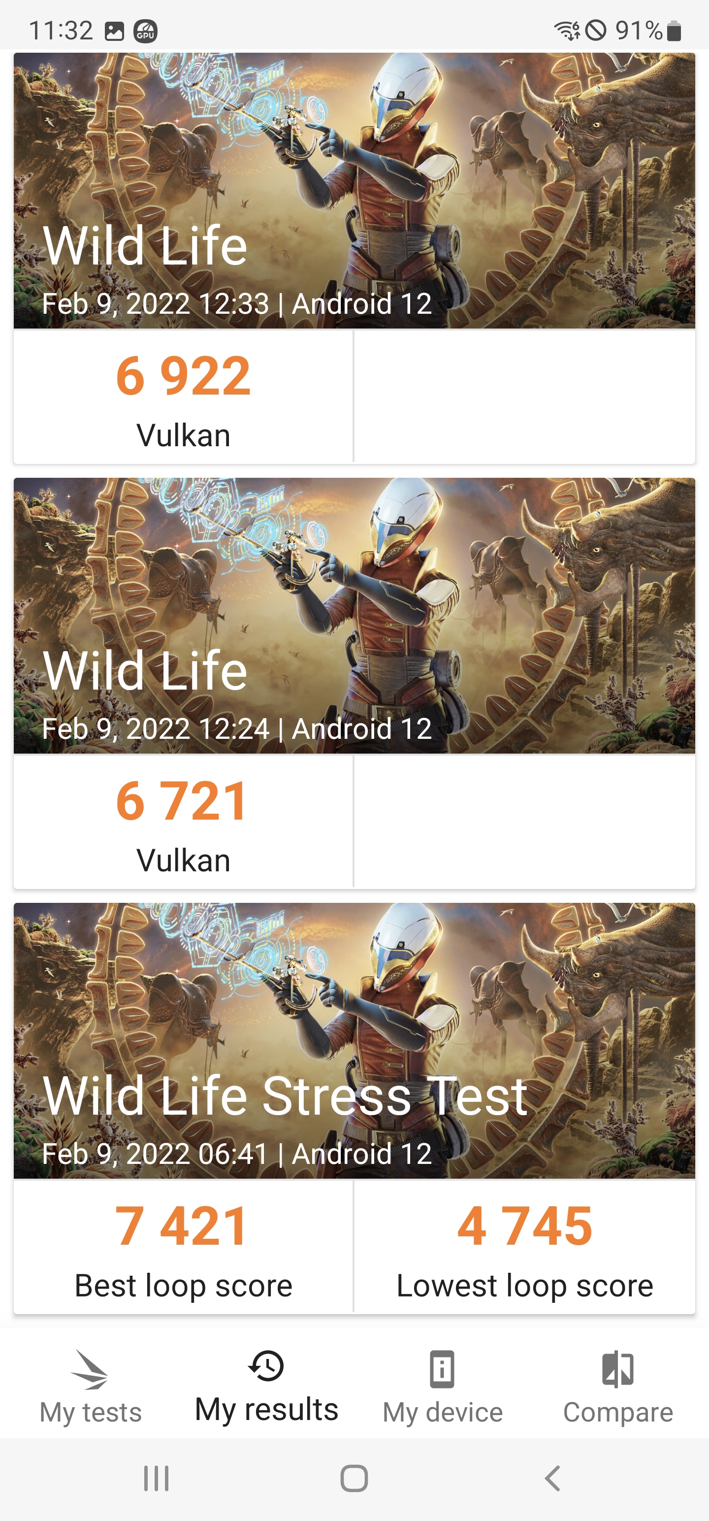 Ναι μεν τα πάντα τρέχουν γρήγορα, εξακολουθούμε να πιστεύουμε πως η εταιρεία θα έπρεπε να φροντίσει ώστε όλοι οι χρήστες σε όλο τον κόσμο, να παίρνουν την ίδια συσκευή για να έχουν την ίδια εμπειρία χρήσης, και όχι κάποιοι το Snapdragon 8 Gen 1 (που κυκλοφορεί σε αγορές όπως αυτή των ΗΠΑ) και οι υπόλοιποι τον Exynos. Και αυτό γιατί για ακόμα μια φορά η GPU του Exynos φαίνεται πως είναι υποδεέστερη του Adreno 730, παρόλο που είχαμε πραγματικά μεγάλες προσδοκίες. Η συνεργασία της Samsung με την AMD «γέννησε» την Xclipse 920 GPU και πραγματικά περιμέναμε πως και πώς να δούμε πως αυτή αποδίδει. Ξεκινώντας από το 3D Mark, πήραμε ένα αποτέλεσμα της τάξης των 7421 πόντων, μεγαλύτερο από το αντίστοιχο των Andreno 660 που έχουν οι Snapdragon 888, όμως στο Stress test οι επιδόσεις μειώθηκαν αρκετά γρήγορα φτάνοντας στο τέλος στις 4745 πόντους. .