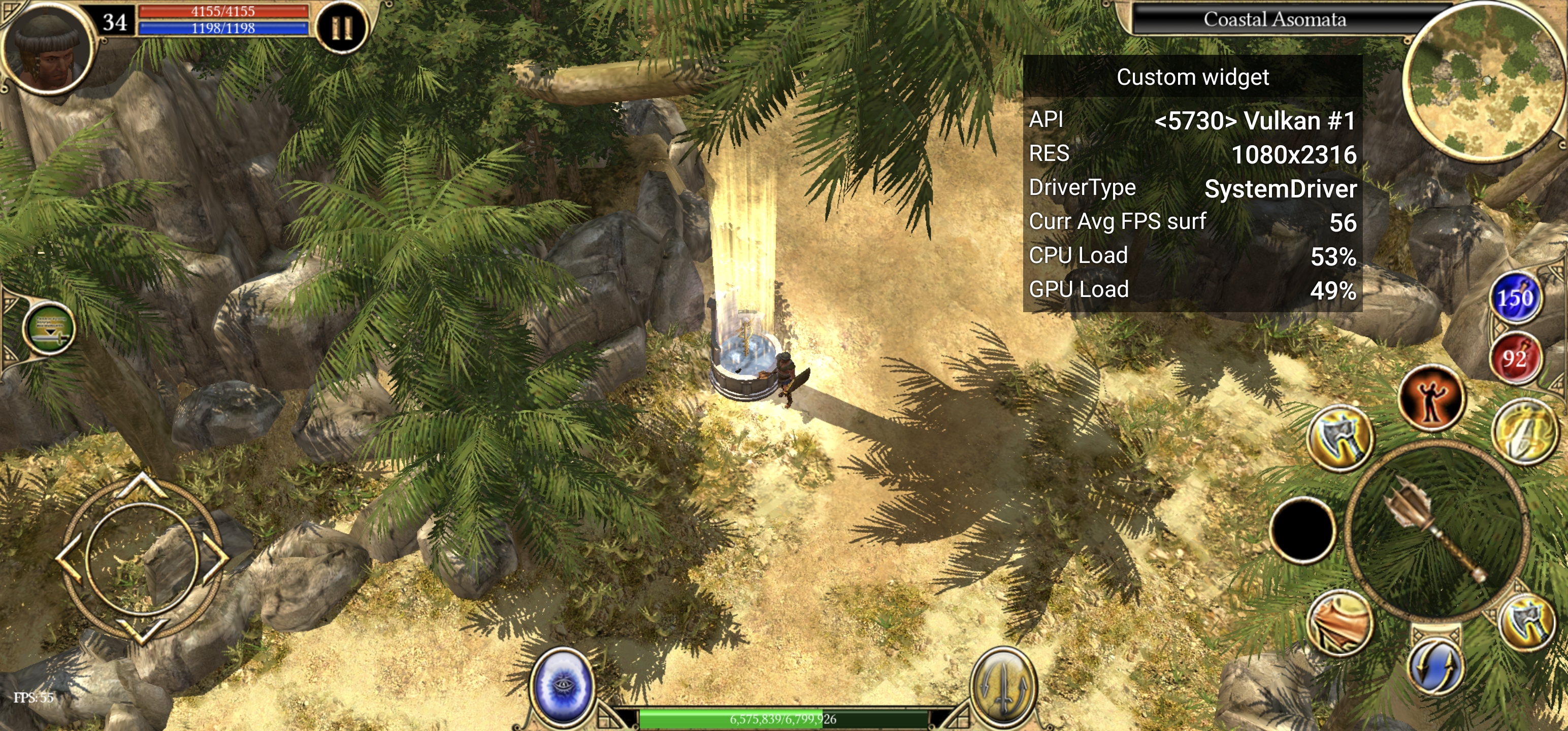 Συνεχίζοντας τη προσπάθειά να δούμε πως αποδίδει η GPU, στραφήκαμε στα παιχνίδια ξεκινώντας από το αρκετά βαρύ Genshin Impact. Το αποτέλεσμα (με όλα τα εφέ στο max και στα 60fps) δεν μας άρεσε καθόλου, με το frame rate να παίζει μεταξύ 30 και 50 fps, με το παιχνίδι να φαίνεται πως είχε κάποια προβλήματα frame pacing. Βάλαμε μετά το Titan Quest, ένα σχετικά ελαφρύ παιχνίδι με unlimited frame rate, έχοντας την οθόνη ρυθμισμένη στη native ανάλυση. Στα μενού του παιχνιδιού (πχ βάζοντας το χάρτη) το frame rate έφτανε στα 100-120fps (το βλέπαμε τόσο μέσα από το GPU watch της Samsung που ενεργοποιείται από τα developer options όσο και μέσα από το frame rate που δείχνει το παιχνίδι).