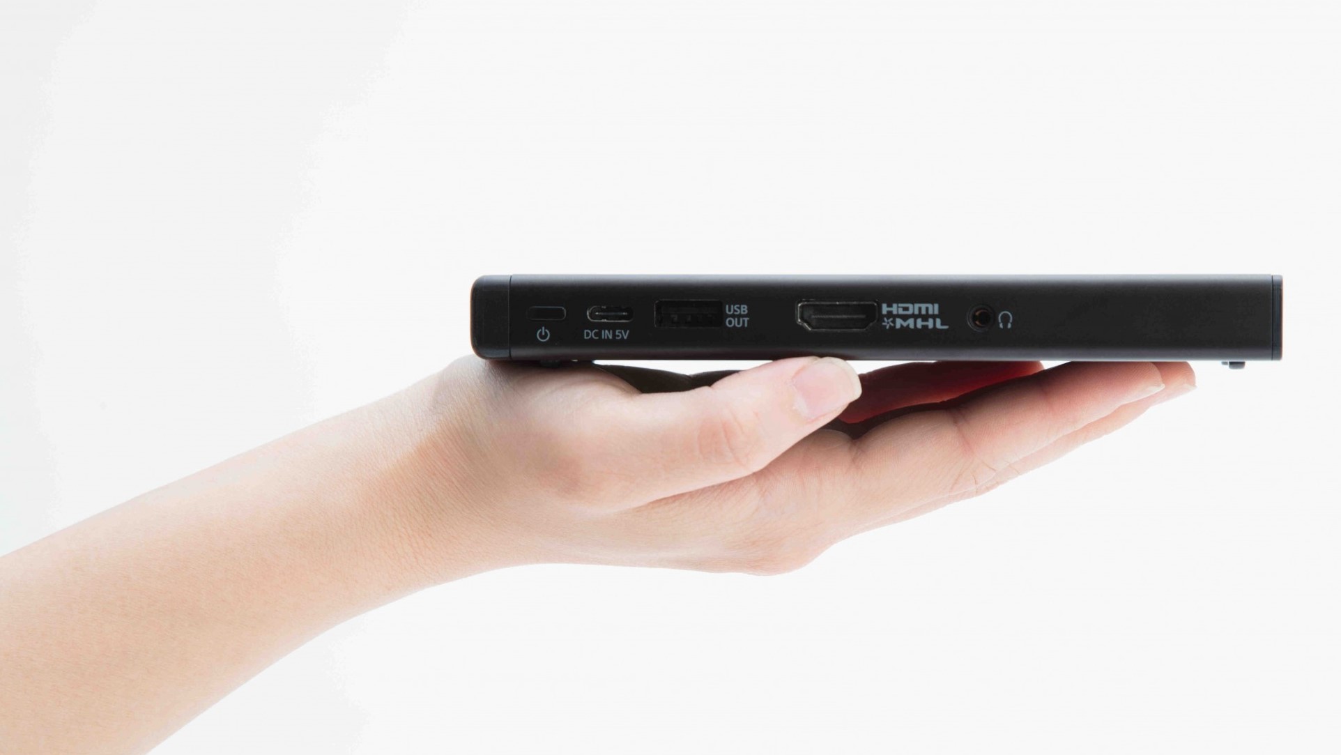 Παίρνοντάς τον στα χέρια, ουσιαστικά έχουμε μια συσκευή με που οι διαστάσεις της είναι αντίστοιχες με ένα 6ιντσο τηλέφωνο, αν και το πάχος είναι μεγαλύτερο. Κάποιος θα μπορούσε να πει ότι θυμίζει powerbank. Στη μπροστινή πλευρά έχουμε τον προβολέα, αριστερά ένα διακόπτη για τη ρύθμιση της εστίασης, στο κάτω μέρος μια κλασσικού τύπου θέση τοποθέτησης τριπόδου και δεξιά τις θύρες επικοινωνίας. Συγκεκριμένα, βρίσκουμε είσοδο HDMI, έξοδο ακουστικών, έξοδο USB (που μπορεί να λειτουργήσει και για τη φόρτιση συσκευών) και μια Type-C USB που χρησιμοποιείται για τροφοδοσία ρεύματος, ενώ επίσης εδώ είναι και το power button. Ο προβολέας ενσωματώνει μπαταρία 5000mAh η οποία φορτίζει σε περίπου 2,5 ώρες με φορτιστής 5V/3A και προσφέρει περίπου 2 ώρες αυτονομίας. Ο ίδιος ο προβολέας είναι τεχνολογίας DLP, έχει φωτεινότητα λίγο πάνω από τα 100 ANSI lumens, λειτουργεί σε ανάλυση 854x480 pixel (16:9) και προσφέρει αντίθεση 5000:1. Δε διαθέτει μενού και ουσιαστικά η μόνη αλλαγή που μπορεί να κάνει ο χρήστης είναι να ρυθμίσει το focus, ανάλογα με την απόσταση προβολής από το μέσο προβολής (πχ τοίχος). Η μέγιστη οθόνη προβολής είναι οι 120 ίντσες (σε απόσταση περίπου 3,5 μέτρων).