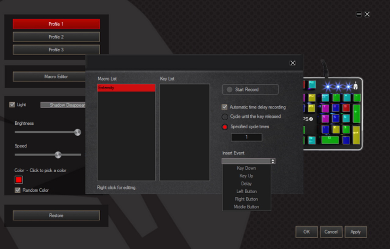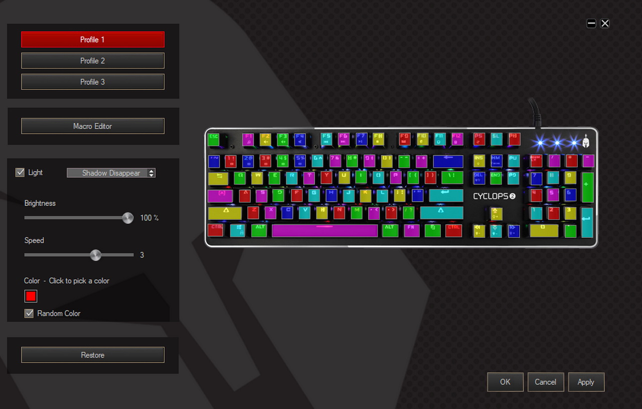 Το πρόγραμμα δεν είναι κάτι το φοβερό, πρόκειται για μία απλή μάσκα όπου μπορείς να επιλέξεις ανάμεσα σε τρία προφίλ και του macro editor. Το κάθε προφίλ μπορεί να επεξεργαστεί από τον χρήστη με συγκεκριμένους τρόπους, φυσικά με την επιλογή να υπάρχει φωτισμός και σε τι μορφή θέλουμε να τον προβάλουμε. Θέλουμε ένα τρελό και εναλλασσόμενο Rainbow Wheel effect ή μήπως ένα πιο μυστήριο εφέ τύπου Shadow Disappear, όπου το κάθε πλήκτρο που πατιέται κάνει ένα μικρό fade-out effect; Ανάλογα με το εκάστοτε εφέ υπάρχουν και διάφορες επιλογές, όπως π.χ. το Speed για να ορίσουμε την ταχύτητα των κινούμενων εφέ ή το Brightness το οποίο μπορεί να κάνει την διαφορά κατά τη διάρκεια της χρήσης του πληκτρολογίου σ’ ένα πολύ σκοτεινό περιβάλλον. Οι φωτισμοί είναι έντονοι και μπορούμε αντί για τυχαία πολύχρωμους φωτισμούς να επιλέξουμε ένα συγκεκριμένο χρώμα της αρέσκειάς μας. H επιλογή της Spartan Gear να δώσει στο πληκτρολόγιο έξτρα επιλογές μέσω ενός λογισμικού μας άρεσε πολύ, αλλά αυτό δε σημαίνει ότι ξέχασε την όμορφη περσινή πινελιά των Game Modes και την άμεση εναλλαγή τους μέσω των πλήκτρων. Τα 5 διαφορετικά Game Modes ενεργοποιούνται άμεσα με το πλήκτρο FN και ένα εκ των αριθμητικών πλήκτρων του Cyclops 2 (1 εως 5). Κάθε ένα από αυτά τα modes φωτίζει πολύ συγκεκριμένα πλήκτρα, τονίζοντας τα απαραίτητα πλήκτρα για το εκάστοτε παιχνίδι. Στο FPS mode έχουμε φως στα πλήκτρα A, S, D, W, στα βελάκια και στο Escape. Το LoL mode φωτίζει τα A, S, D, F, Q, W, E, R, 1, 2, 3, 4, 5, 6, και 7. Ο φωτισμός είναι εξαιρετικός γιατί προσφέρει την ένταση που απαιτεί ένα ορθολογικό gaming mode και παρ΄ότι μας άρεσαν τα «τρελά» διακοσμητικά μοτίβα, τα modes που επικεντρώνονται σε παιχνίδια όπως το COD θα προτιμηθούν από το hardcore κοινό.