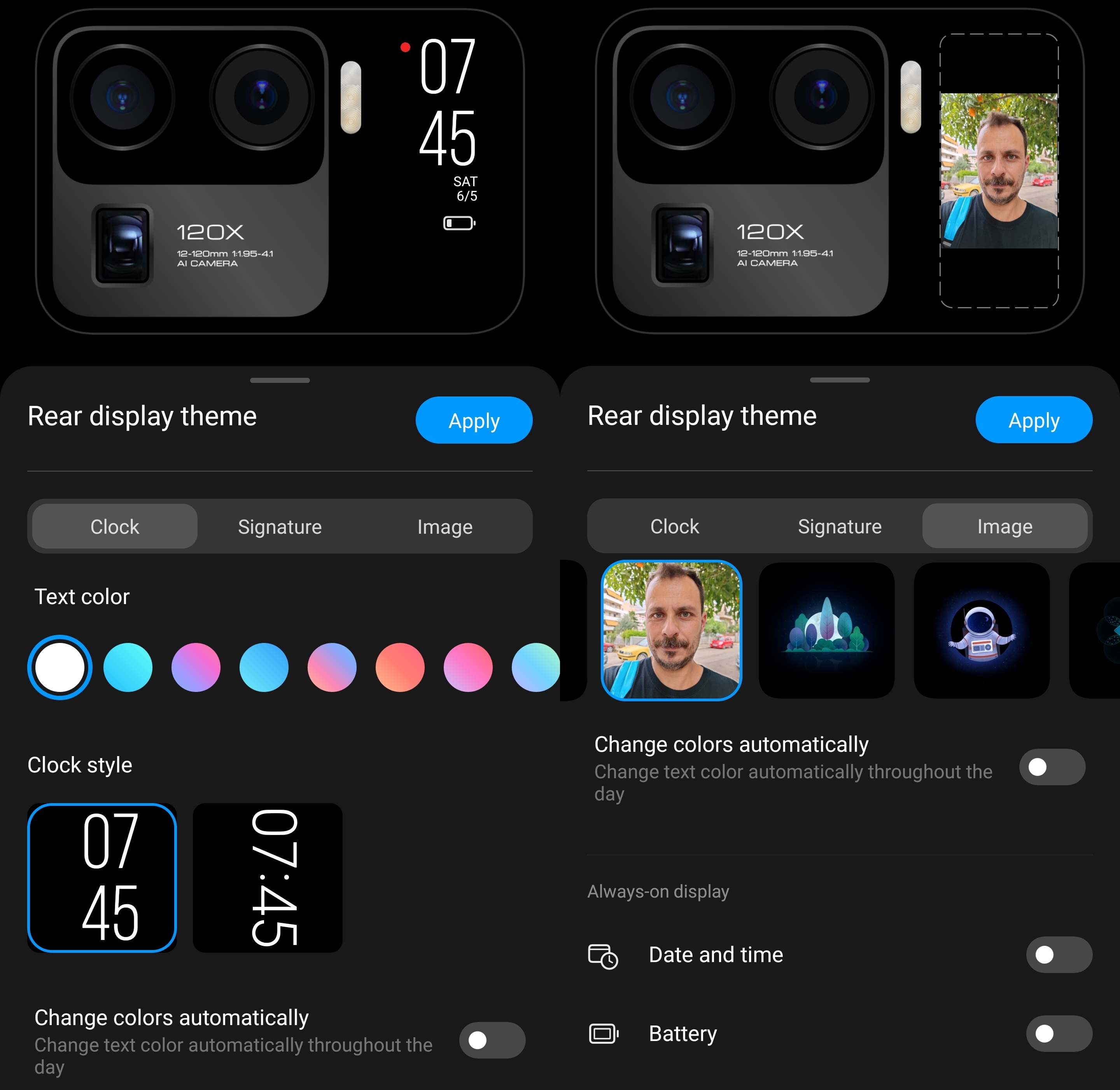 Μέσα από το MIUI 12.5 έχουμε διάφορες δυνατότητες για το τι θα εμφανίζεται στην οθόνη της πλάτης, αλλά ότι και να διαλέξουμε, ο μέγιστος χρόνος εμφάνισης είναι τα 15 δευτερόλεπτα. Ανά πάσα στιγμή μπορούμε με διπλό χτύπημα πάνω της, να τη ξυπνήσουμε και να δούμε πχ την ώρα. Μπορεί κανείς να βάλει να εμφανίζεται είτε ένα μεγάλο ψηφιακό ρολόι είτε μια ψηφιακή υπογραφή, είτε μια φωτογραφία, με τις επιλογές σε κάθε περίπτωση να είναι πολλές ενώ για τις φωτογραφίες μπορούμε να χρησιμοποιήσουμε δικές μας. Προφανώς η χρησιμότητα της οθόνης σε καθημερινή χρήση είναι μικρή, καθώς για να τη χρησιμοποιήσει κανείς θα πρέπει να έχει το τηλέφωνο με την μεγάλη οθόνη πάνω σε μια επιφάνεια. Ωστόσο εκεί που γίνεται περισσότερο χρήσιμη είναι στις φωτογραφίες, αλλά για αυτό θα μιλήσουμε παρακάτω.