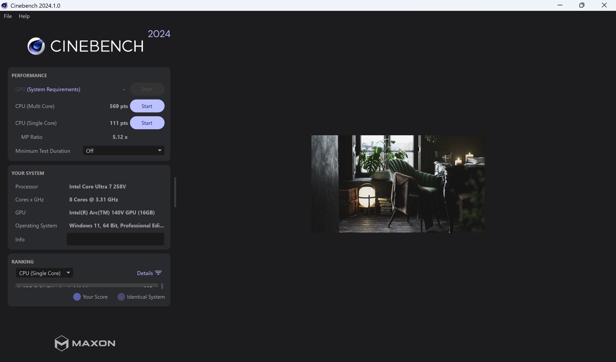 Σε επίπεδο hardware τώρα, το σύστημα έρχεται όπως είπαμε με τον Intel Core 7 Ultra 258V αρχιτεκτονικής Lunar Lake. Έρχεται με 8 πυρήνες χωρίς όμως hyperthreading, άρα συνολικά έχει 8 threads. Οι τέσσερις πυρήνες είναι Performance με συχνότητα έως 4,8Ghz και οι άλλοι τέσσερις είναι Low Power Efficient έως τα 3,7GHz Από εκεί και πέρα τώρα, η ASUS διαθέτει 3 προφίλ όσον αφορά στις επιδόσεις του CPU: Performance, Standard και Whisper, με καθένα από αυτά να αποδίδει διαφορετικά καθώς το TDP είναι διαφορετικό, με το Performance να δίνει τις μέγιστες επιδόσεις. Τρέχοντας το Cinebench 2024 (multicore) πήραμε κατά σειρά 569 και 111 πόντους αντίστοιχα στο multi και single thread τεστ αντίστοιχα, επιδόσεις παραπλήσιες με αυτές που είχαμε δει και στο Zenbook.