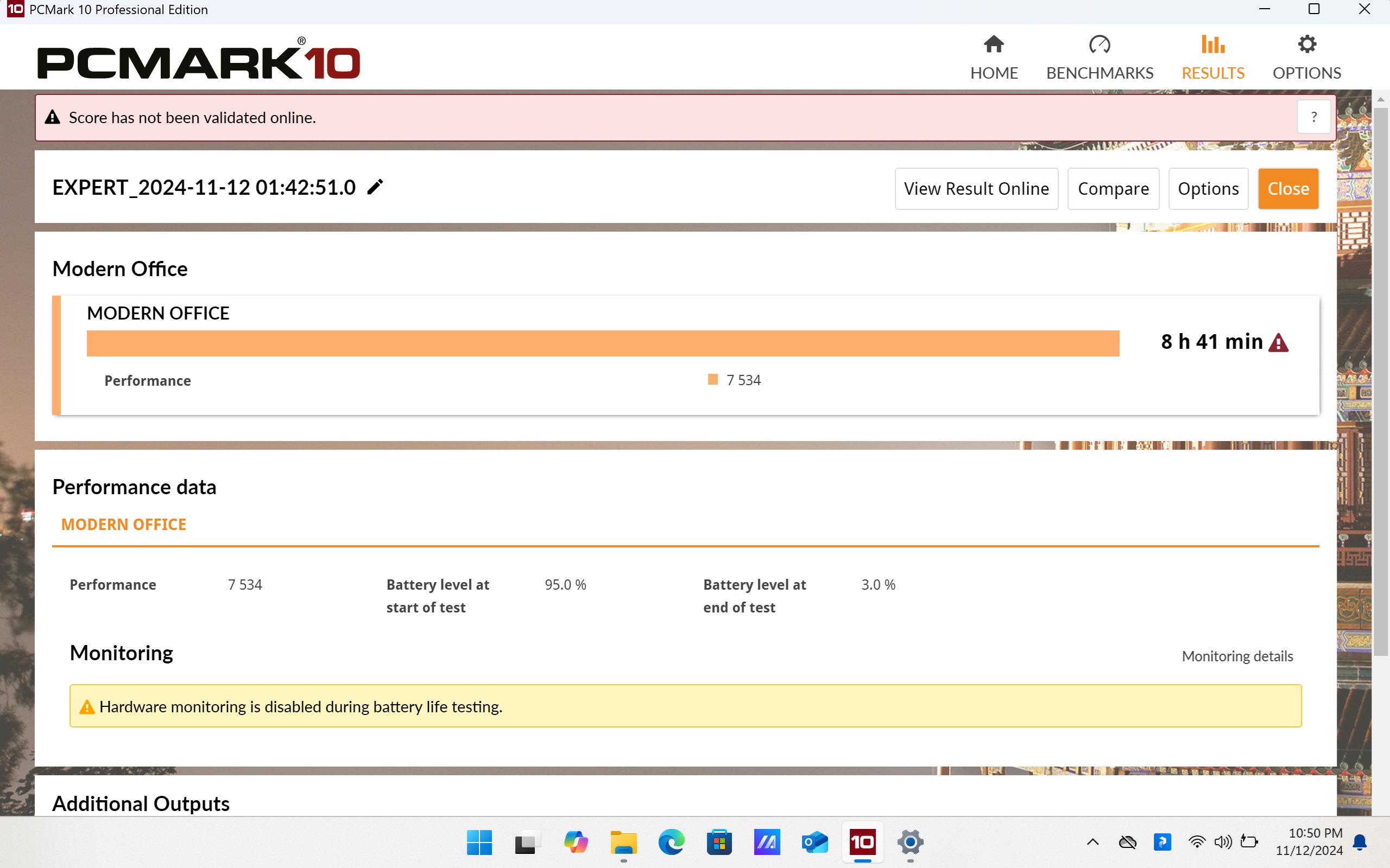 Το άλλο μεγάλο πλεονέκτημα του υπολογιστή είναι η αυτονομία του η οποία είναι μεγάλη μεν, αλλά δε φτάνει στα επίπεδα του Zenbook S14. Από τη μια έχουμε μικρότερη μπαταρία κατά σχεδόν 15%, από την άλλη μάλλον και η οθόνη δεν είναι τόσο energy efficient σε σχέση με την OLED του Zenbook, οπότε η αυτονομία βρίσκεται στα επίπεδα των 10 ωρών χρήσης γραφείου, καθώς τρέχοντας το PC Mark 10 Battery Office test στο standard προφίλ και τη φωτεινότητα στα 210 nits, μας έβγαλε σχεδόν 8 ώρες και 41 λεπτά για να πάει από το 95% στο 3%.