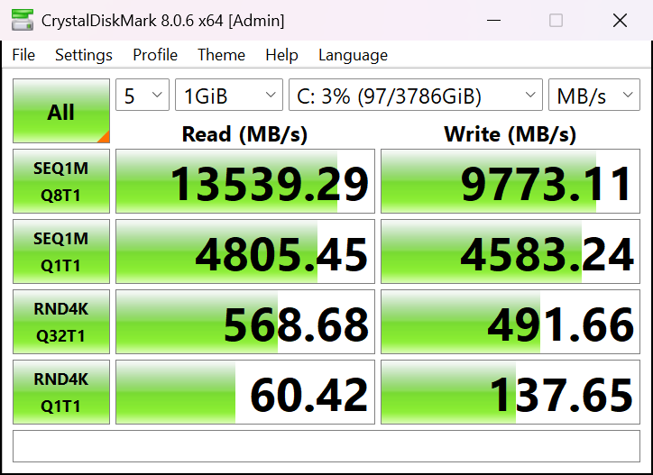 Σε επίπεδο hardware τώρα, το σύστημα είναι από τα πλέον εξοπλισμένα που μπορεί να βρει κανείς. Η έκδοση της δοκιμής έρχεται με το κορυφαίο mobile CPU της Intel, τον ολοκαίνουριο Intel Core Ultra 9 275Hz, ένα 24πύρηνο CPU με 8P και 16E cores και υποστηρίζεται από 64GB μνήμης DDR5 στα 5600Mhz. Όσον αφορά στον αποθηκευτικό χώρο τώρα, βρίσκουμε 2 ταχύτατους NVMe των 2TB σε διάταξη Raid, στο οποίο μετρήσαμε περίπου 13,5GB/sec ταχύτητα ανάγνωσης και περίπου 9,7GB/sec όσον αφορά στην εγγραφή (σύμφωνα με το CrystalDiskMark).