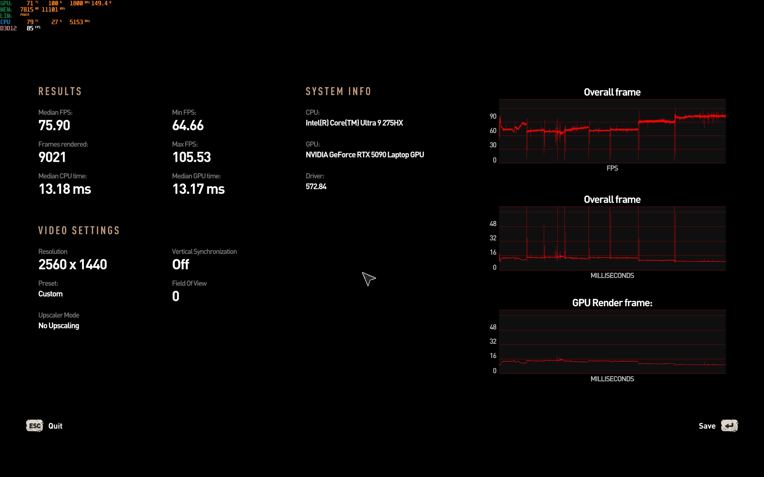 Για του λόγου το αληθές, συγκρίναμε τις επιδόσεις του laptop με τις μετρήσεις που είχαμε πάρει στη desktop RTX5070Ti (σε PC με Ryzen 7 9800Χ3D, 32GB DDR5). Όλα τα benchmark τα τρέξαμε σε 1440p και όχι 1600p που υποστηρίζει η οθόνη για να έχουμε αντιστοιχία στα αποτελέσματα. Σε κάποιες περιπτώσεις επαναλάβαμε τις μετρήσεις μας και στο Performance mode