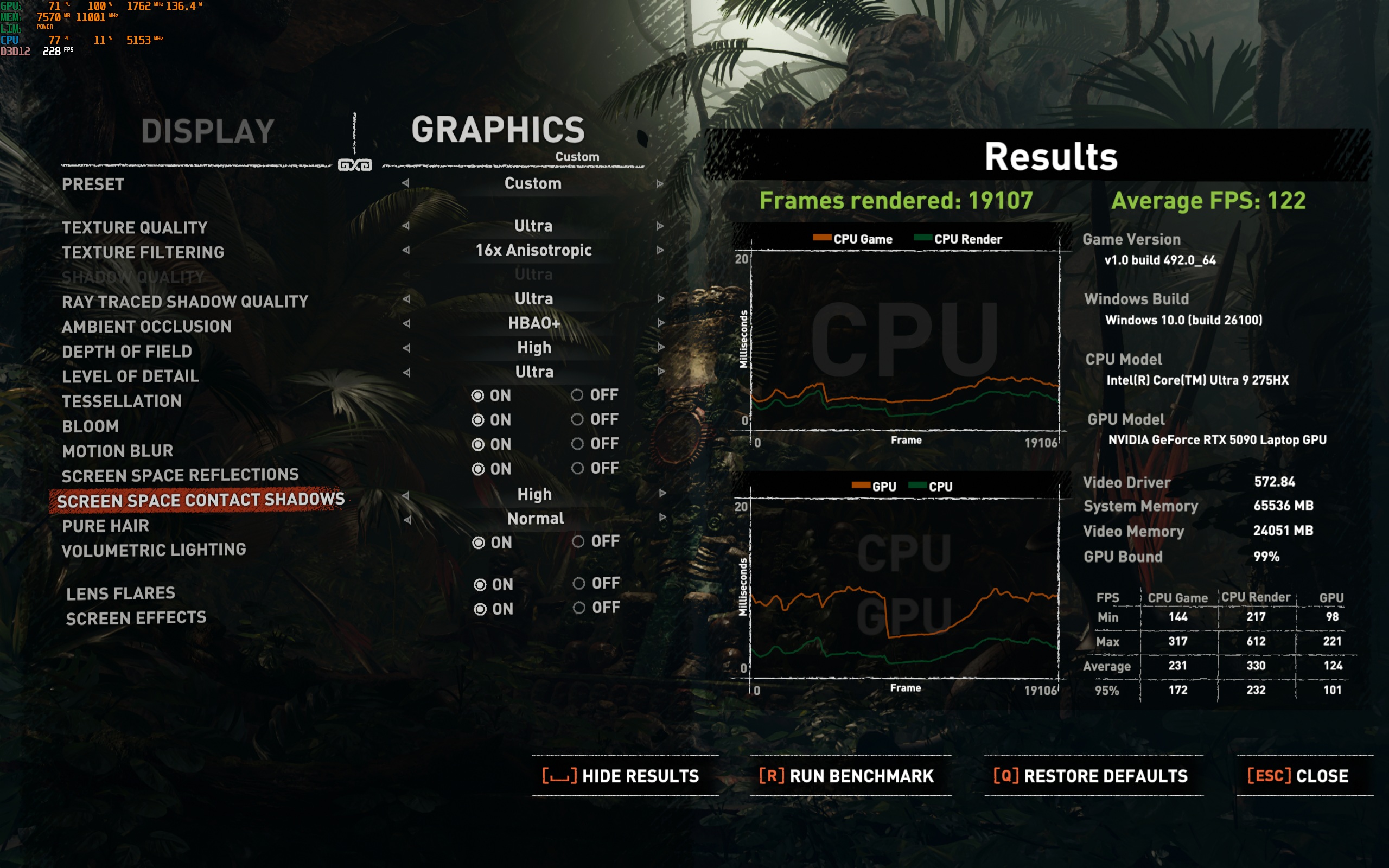 Ξεκινώντας από απλούστερα παιχνίδια όπως το Shadow of the Tomb Raider (Custom Ultra Settings+Ultra RT), πήραμε 130fps (122fps στο Performance mode, desktop με RTX5070Ti: 167fps).