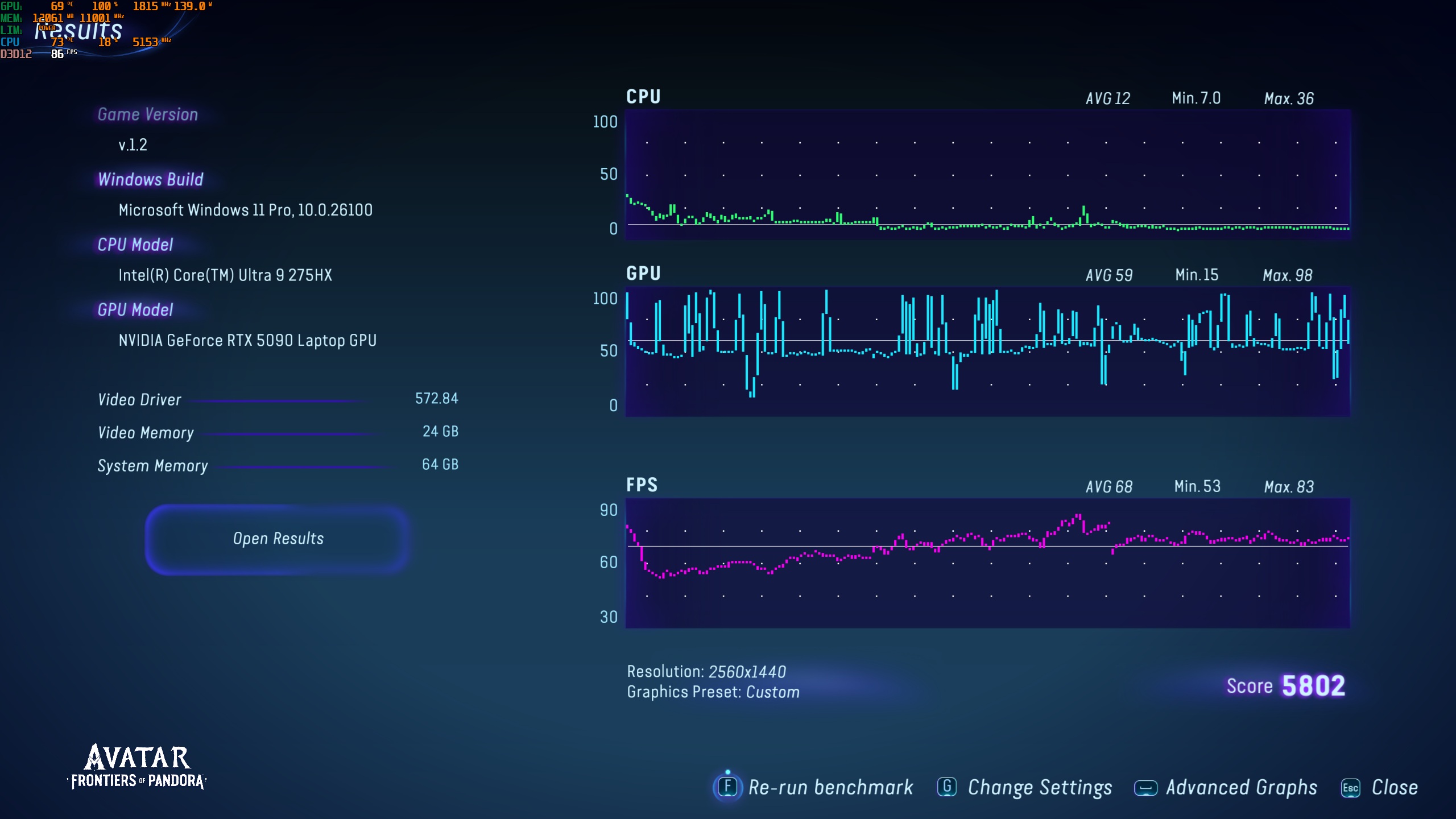 Από τα απαιτητικότερα παιχνίδια είναι το Avatar: Frontiers of the Pandora, το οποίο το τρέξαμε σε Ultra και πήραμε 68fps (76fps στο desktop).